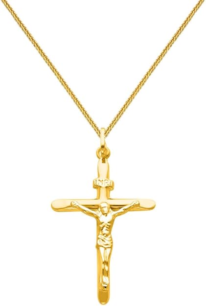 The World Jewelry Center 14k Yellow Gold Crucifix Cross Pendant with 0.8mm Braided Square Wheat Chain Necklace