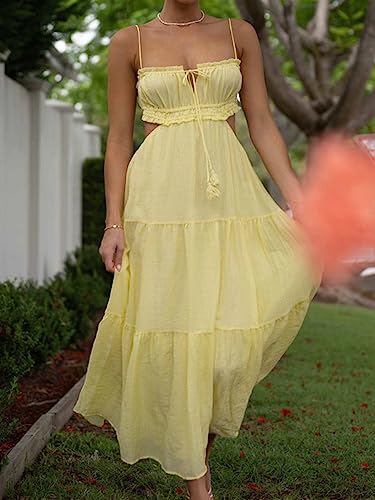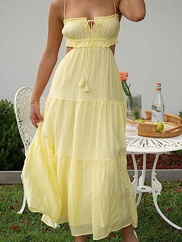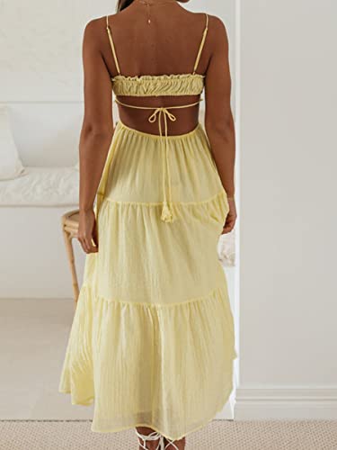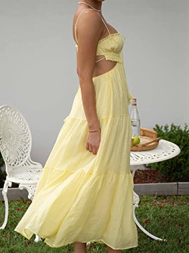 FEORJGP Women Summer Spaghetti Strap Long Dress Boho Low Cut Dress Backless Bodycon Midi Dress High Waist Maxi Dress Beahwear (A Yellow, M)