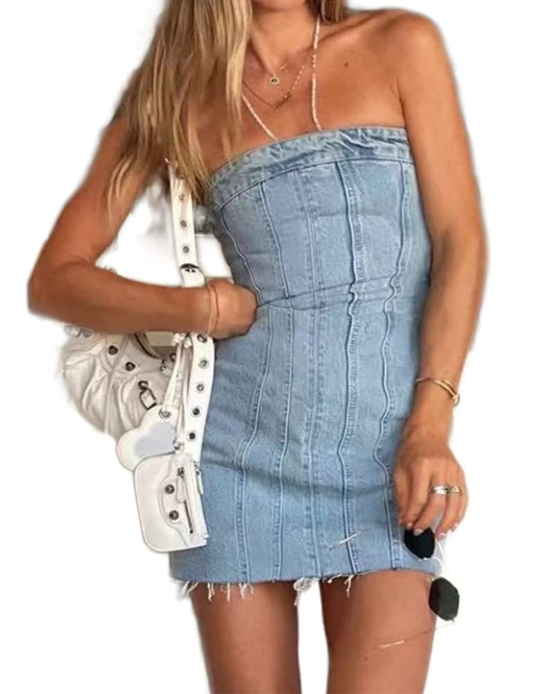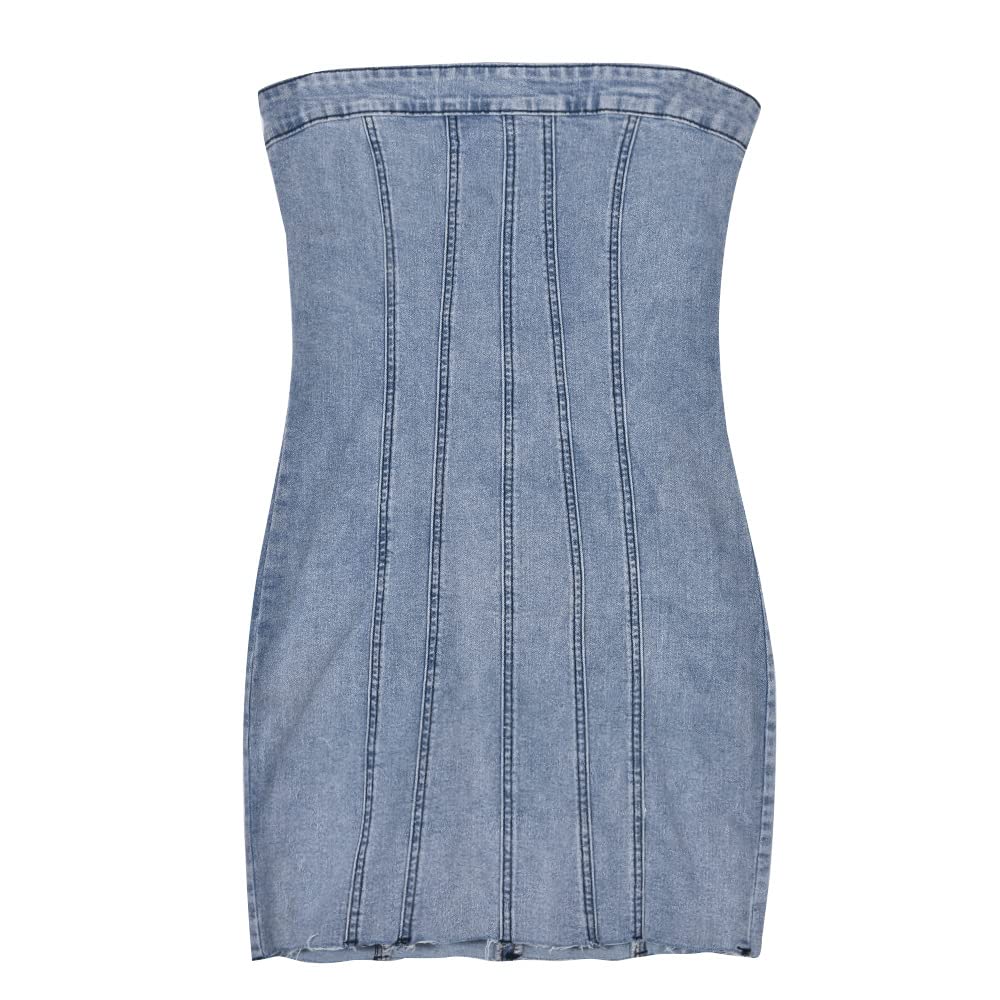 Fronage Women's Summer Sexy Denim Strapless Dresses Jeans Corset Tube Backless Bodycon Top Mini Dress Western Cowgirl 2023 Light Blue, S