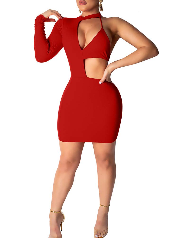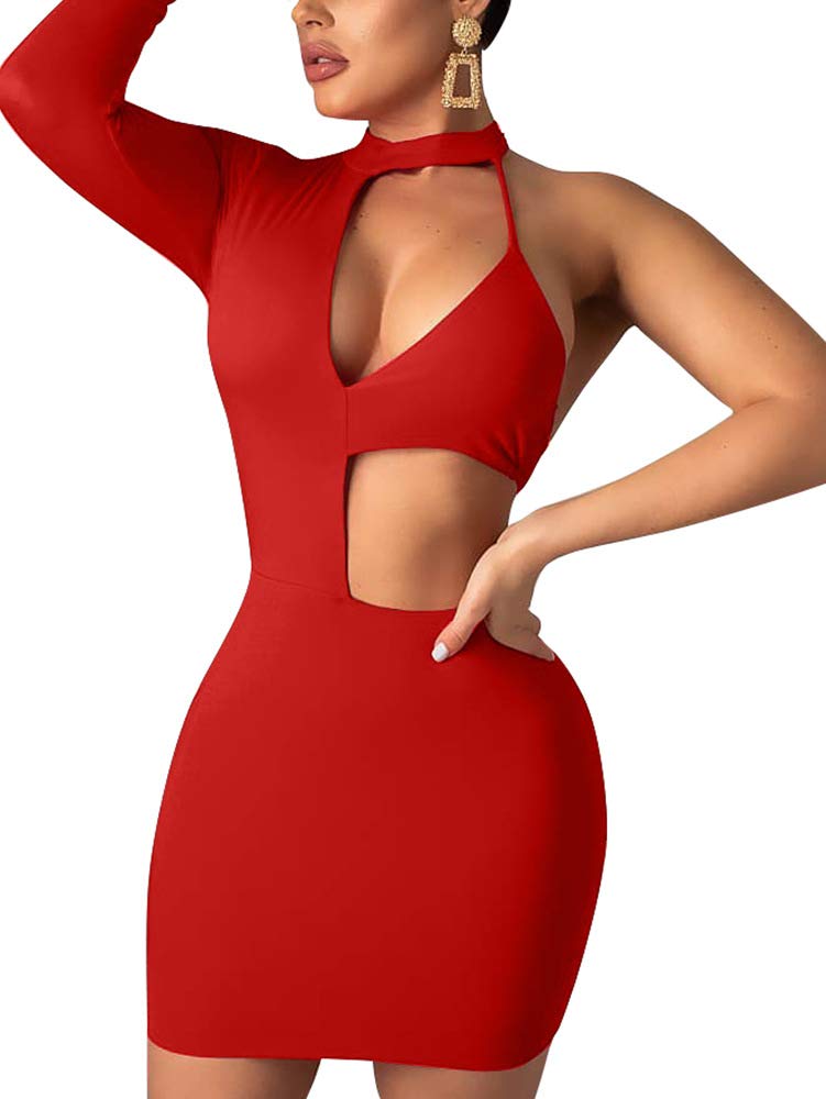 GOBLES Women's Sexy Bodycon Cut Out Long Sleeve Mini Club Cocktail Dress Red