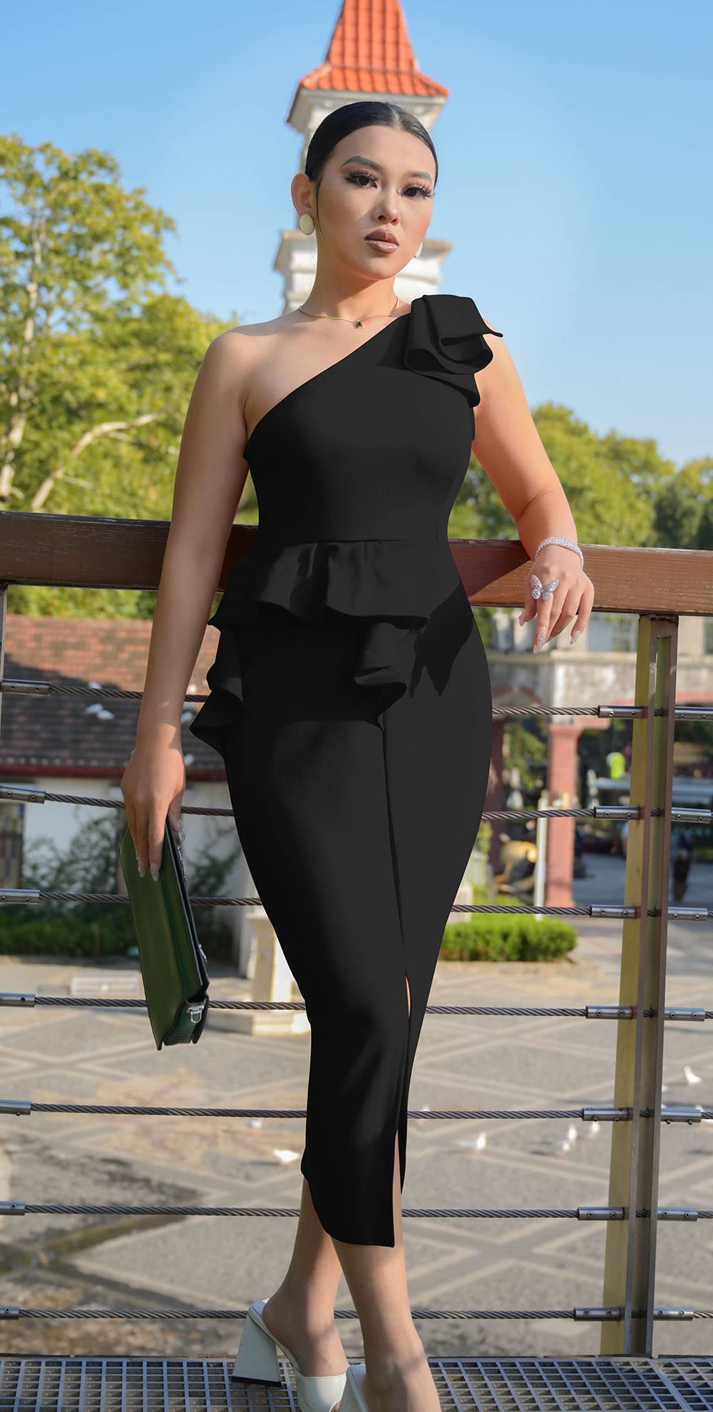 • Features: fashionable one shoulder design with sloping neckline ,ruffles at shoulder and waist part make the dress exquisite and cute,the front split promise you walk freely, back zipper for you to dress up and down easily.
