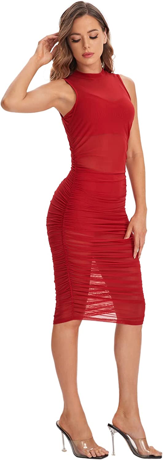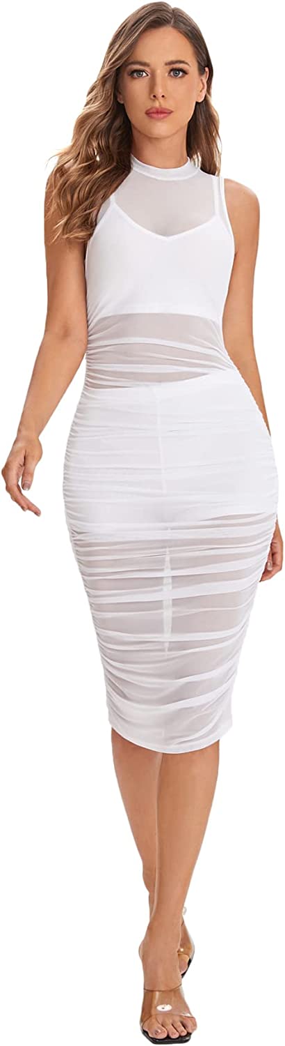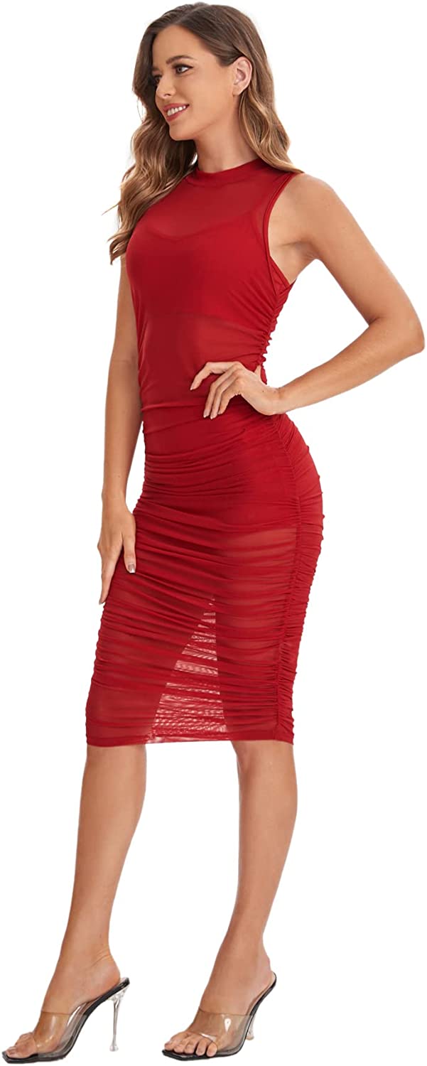 SheIn Women's Sheer Mesh Bodycon Dress Ruched Mock Neck Midi Sheer Dress