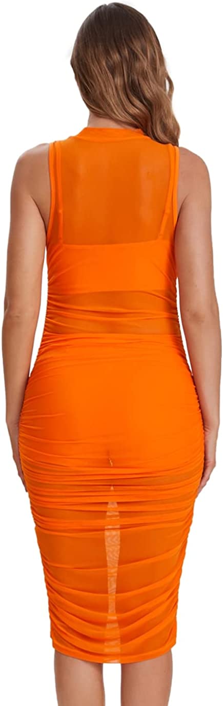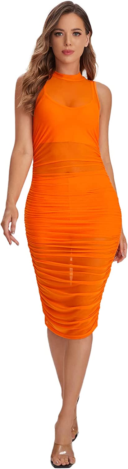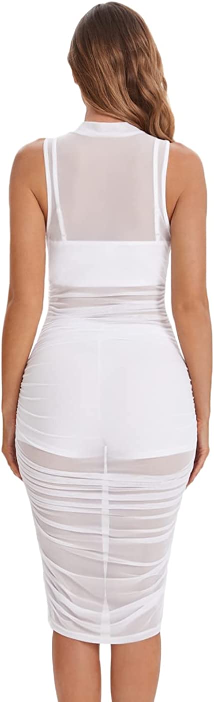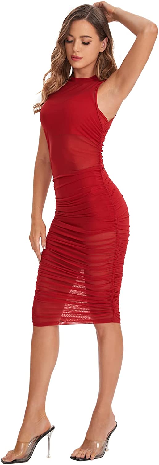 • Mesh sheer see through, sleeveless, mock neck short dress, ruched midi dresses with crewneck design