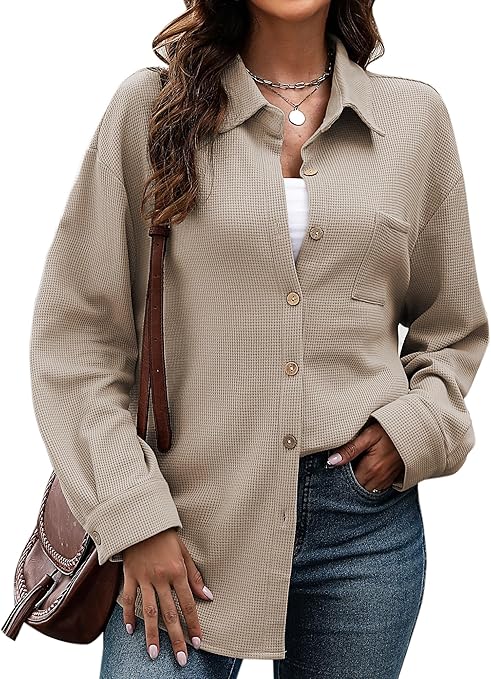 KYLELOVE Women Waffle Button down Shirts Oversized Long Sleeve Knit Shacket Casual Jacket with Pocket