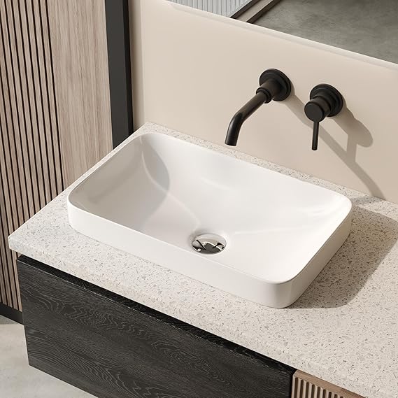 Rectangle Vessel Sink For Bathrooms, 19" x 12" Semi Recessed Bathroom Sink, Modern White Porcelain Ceramic Small Sink Bowl, Above Counter Basin, Restroom Vanity Art Wash Basin