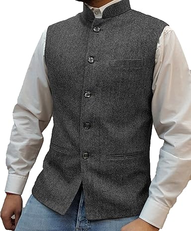 Mens Herringbone Wool Vests Suit Business Tweed High Collar Waistcoats Slim Fit