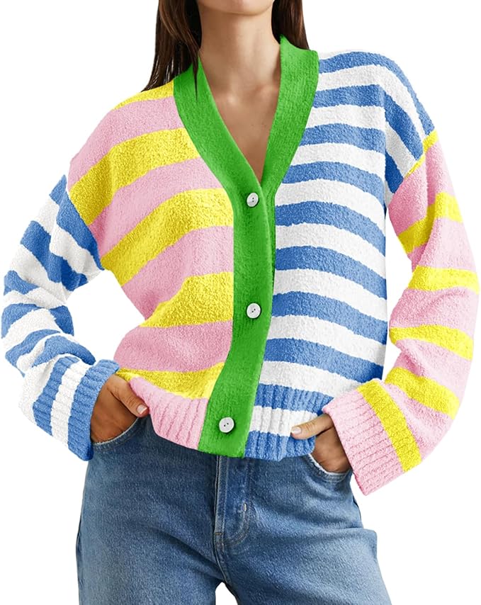 Saodimallsu Womens Striped Cardigan Sweaters V Neck Open Front Button Up Color Block Fuzzy Loose Knit Coats
