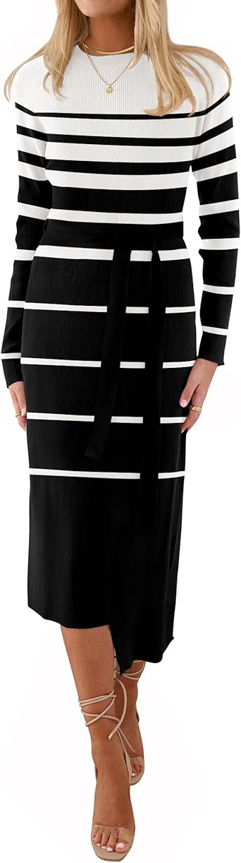 ZESICA Women's 2024 Fall Ribbed Knit Sweater Dress Elegant Long Sleeve Crewneck Tie Waist Slim Fit Bodycon Midi Dresses