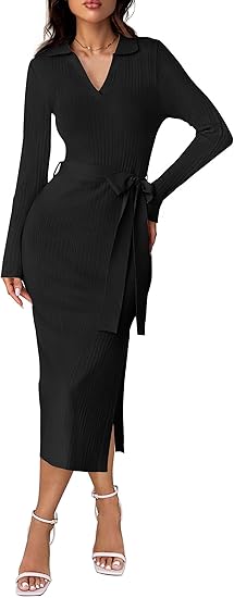 ZESICA Women's Spring Long Sleeve Sweater Dress Lapel V Neck Ribbed Knit Side Slit Bodycon Midi Dresses with Belt