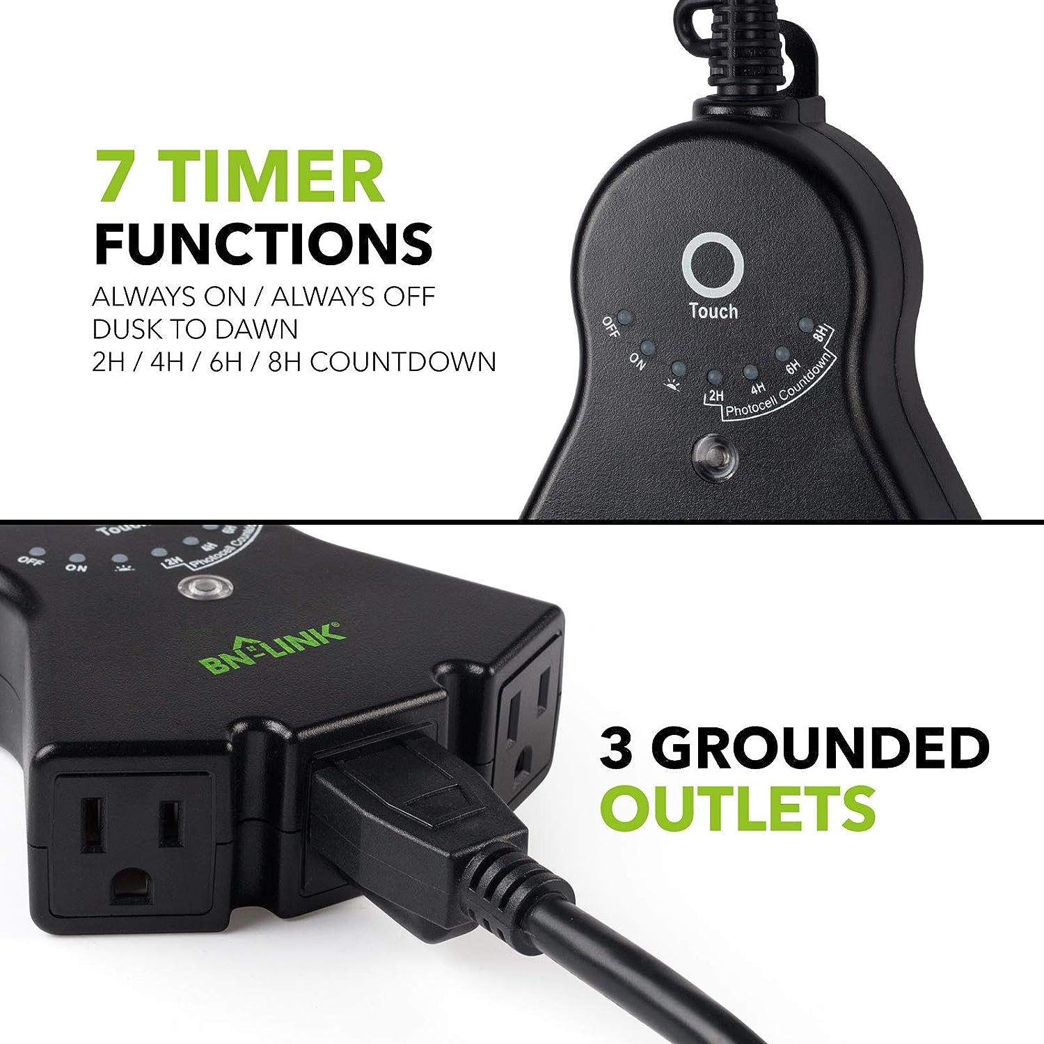 • ✓ PHOTOCELL DUSK TILL DAWN: Built-in light sensor timer, automatically turn outlets on at dusk and off at dawn, or on at dusk and off after 2/4/6/8 hours, repeats daily