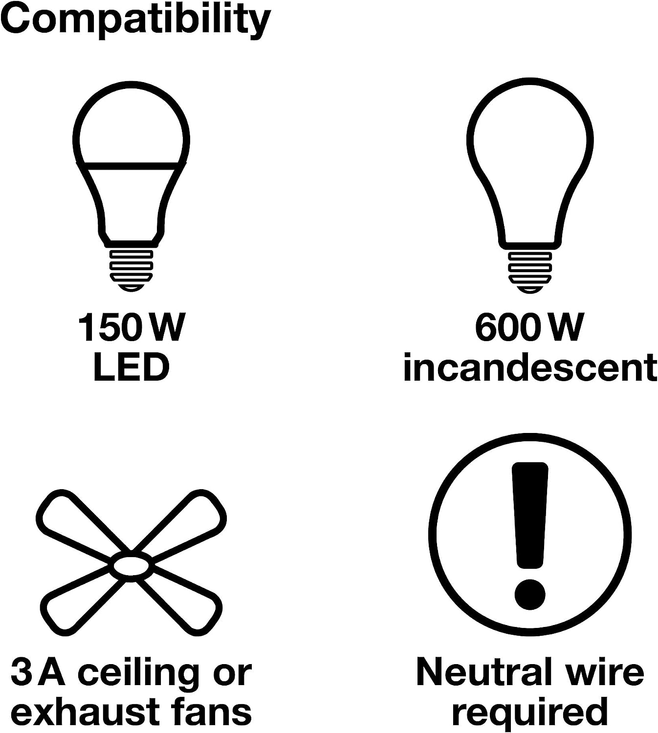 • Can control a 3 Amp high efficiency exhaust fan; compatible with all lighting, including 150 Watts LED, 600 Watt incandescent/halogen, magnetic and electronic low-voltage lighting