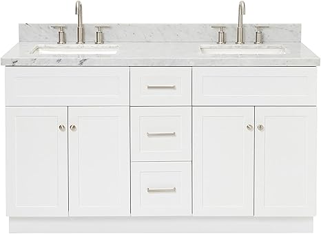 ARIEL 61" White Double Vanity 1.5" Edge Italian Carrara Marble Countertop & Splash, Rectangular Sink, 2 Soft Closing Doors, 3 Full Extension Dovetail Drawers, Toe Kick