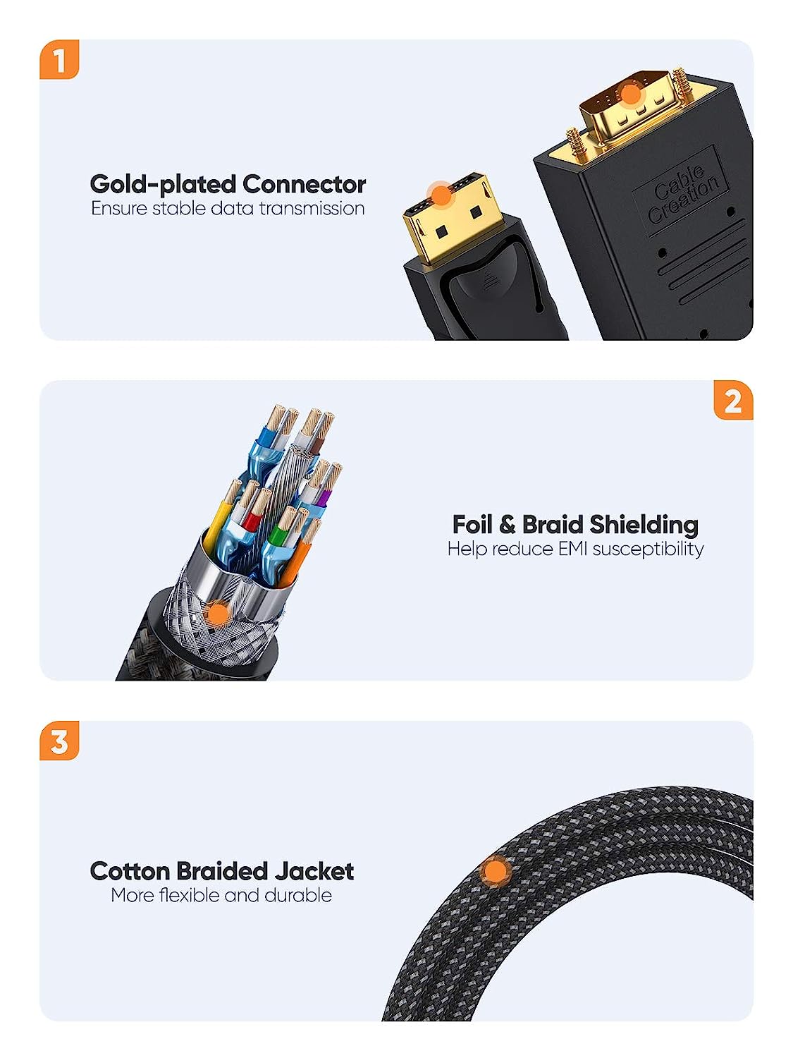 • 【Connection】Gold plated contact, bare copper conductors, and foil & braid shielding combine together to provide both superior cable performance and reliable connectivity.there is embedded clock architecture to help reduce EMI susceptibility.