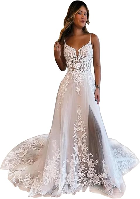 V Neck Lace Wedding Dress for Bride 2024 Spaghetti Strap Long Beach Bridal Gown A-Line