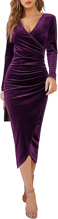 DIRASS Women's Elegant Velvet Long Sleeve Wrap V Neck Ruched Bodycon Cocktail Party Maxi Dress