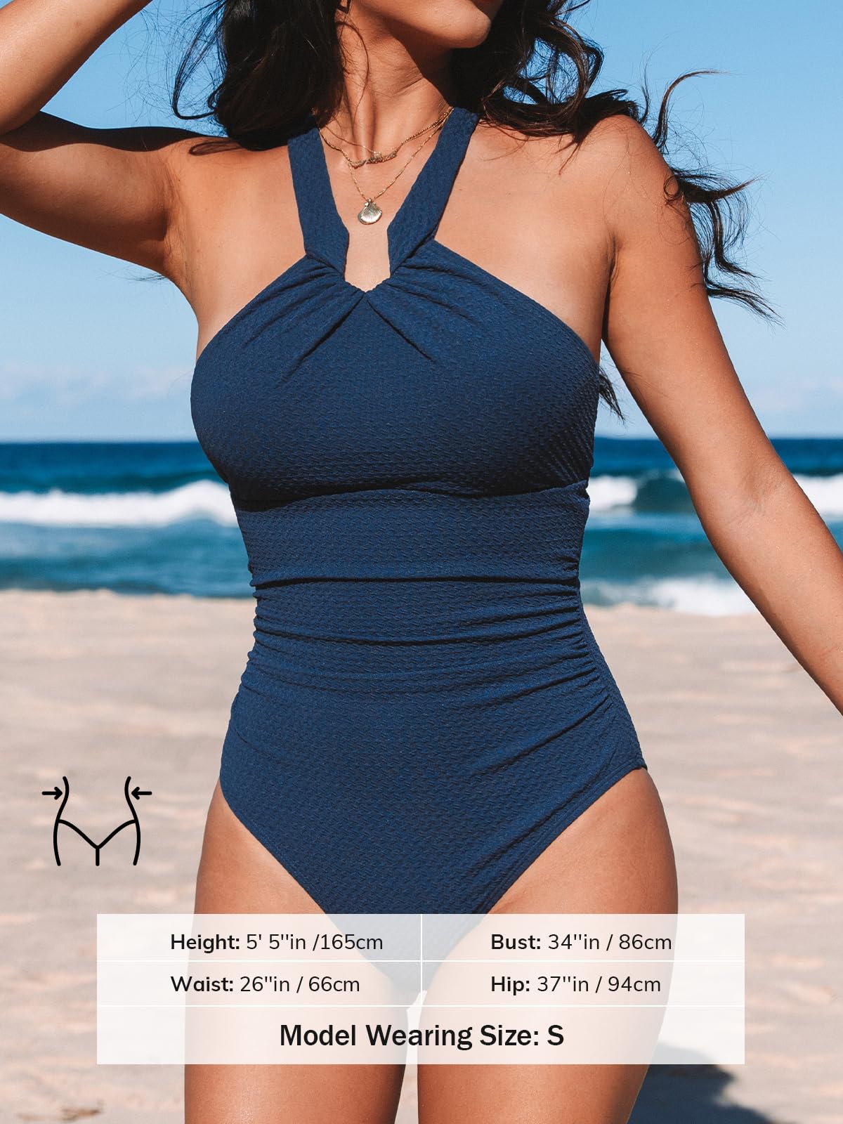 CUPSHE Women's One Piece Swimsuit High Neck Tummy Control Bathing Suit Ruched Crisscross Back Tie Wide Straps Cutout, L Teal Blue