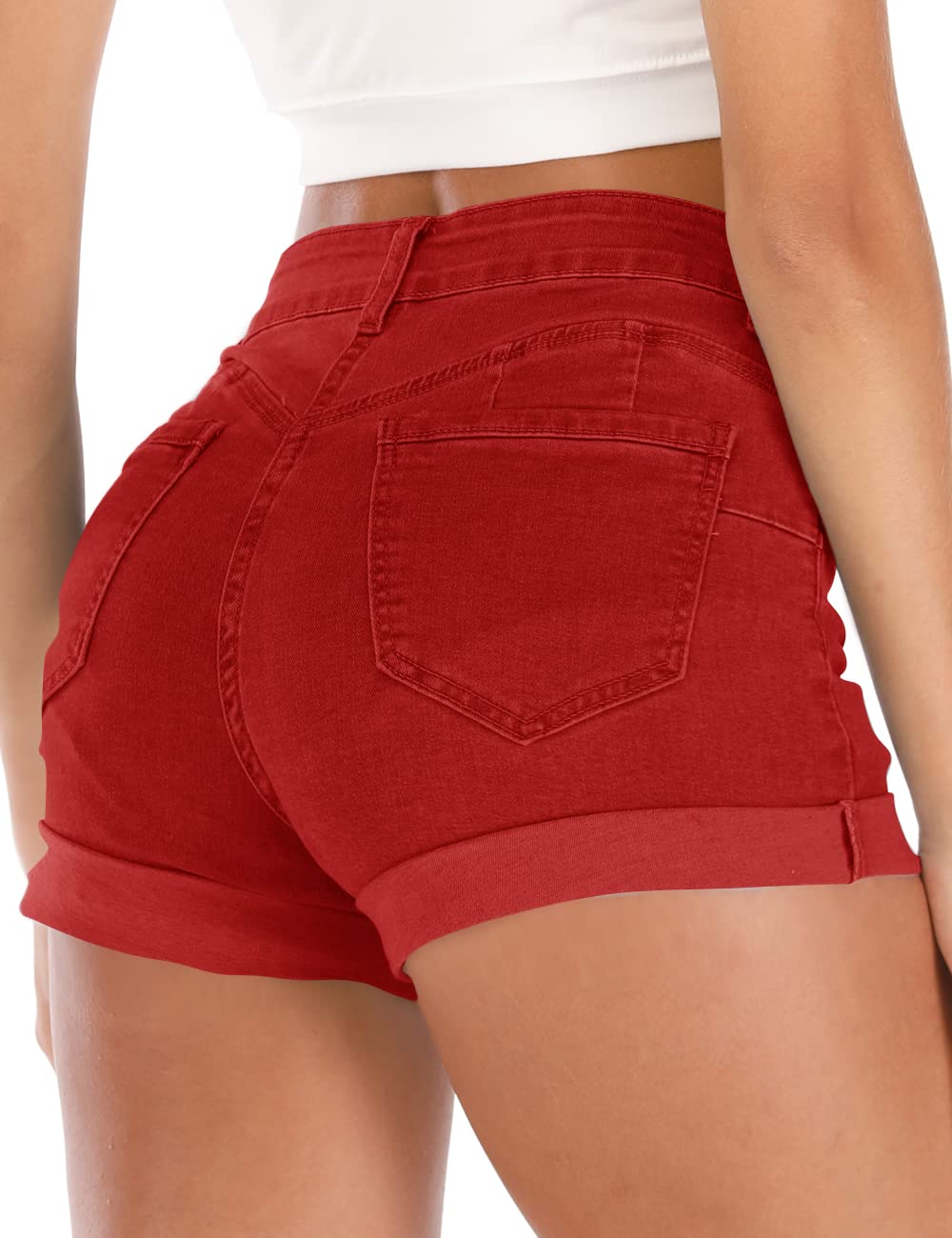 Cuihur Women's Summer High Waisted Denim Shorts Folded Hem Casual Short Jeans Red 20