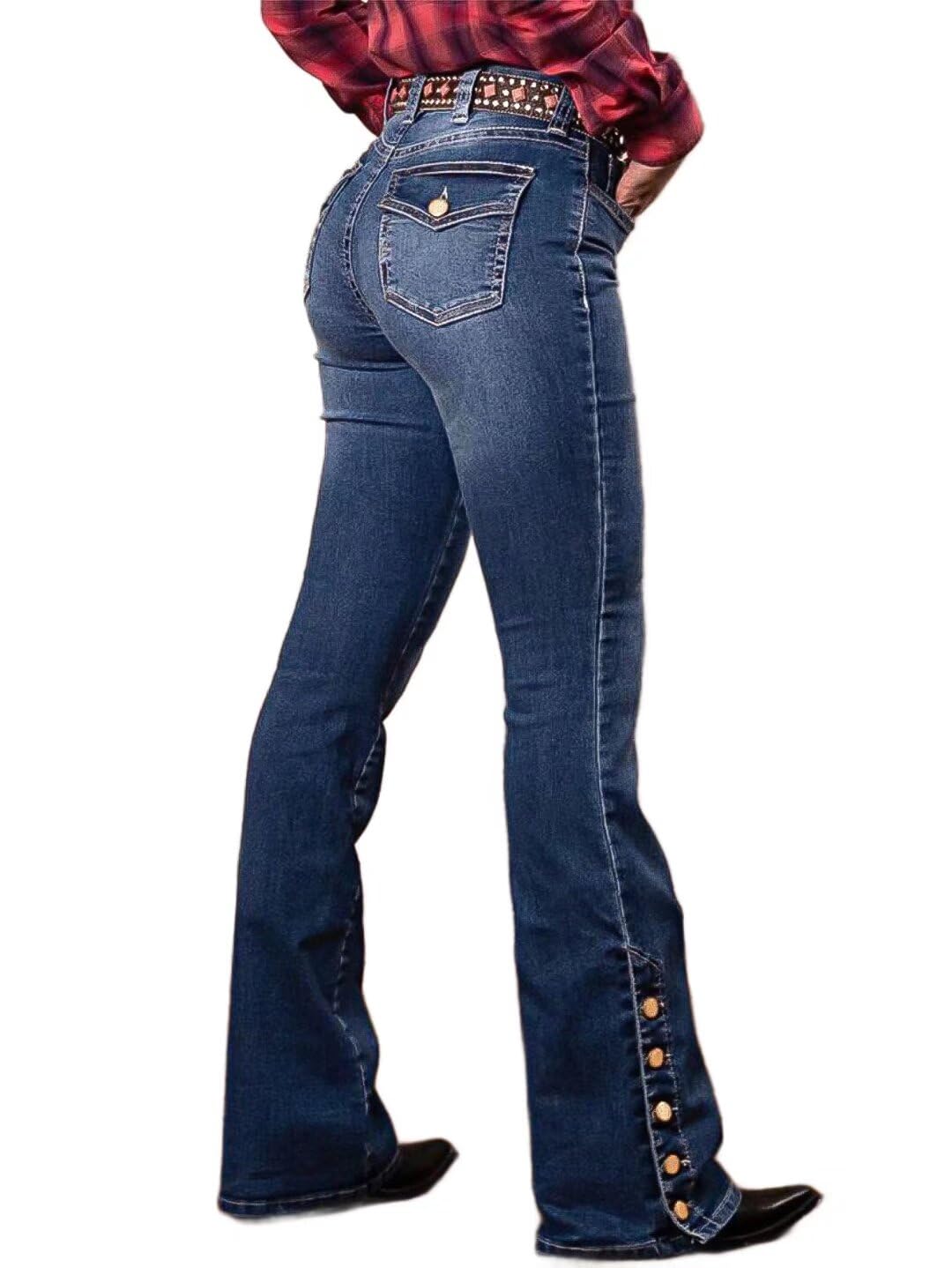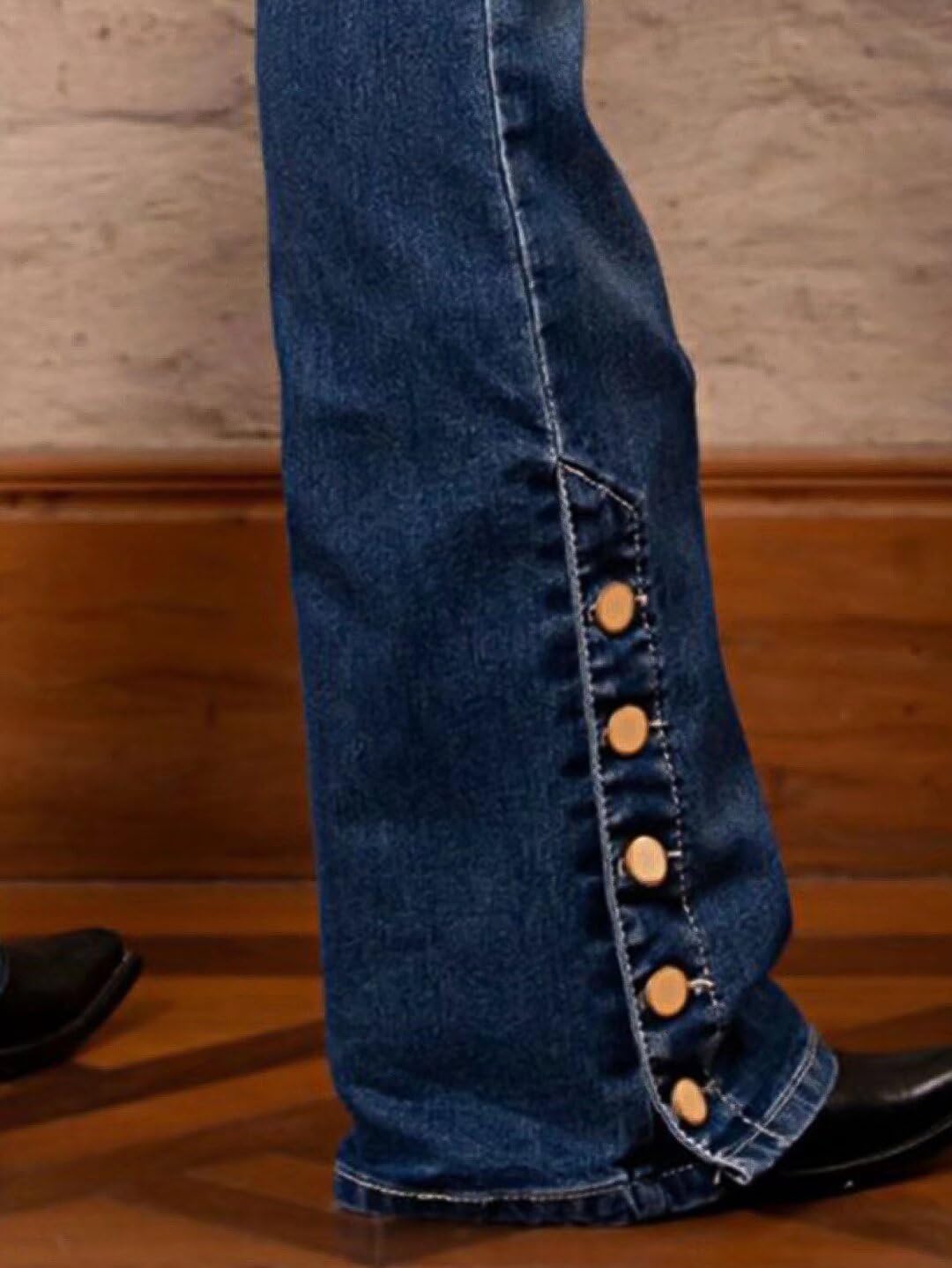 Flamingals Women's Buttoned Hem Bootcut Jeans Without Belt Mid Waist Casual Pants Navy Blue 2XL