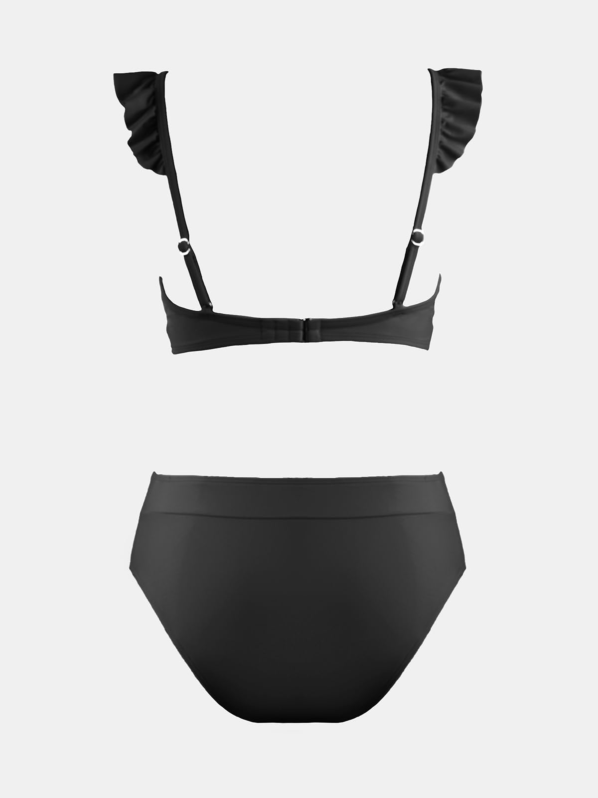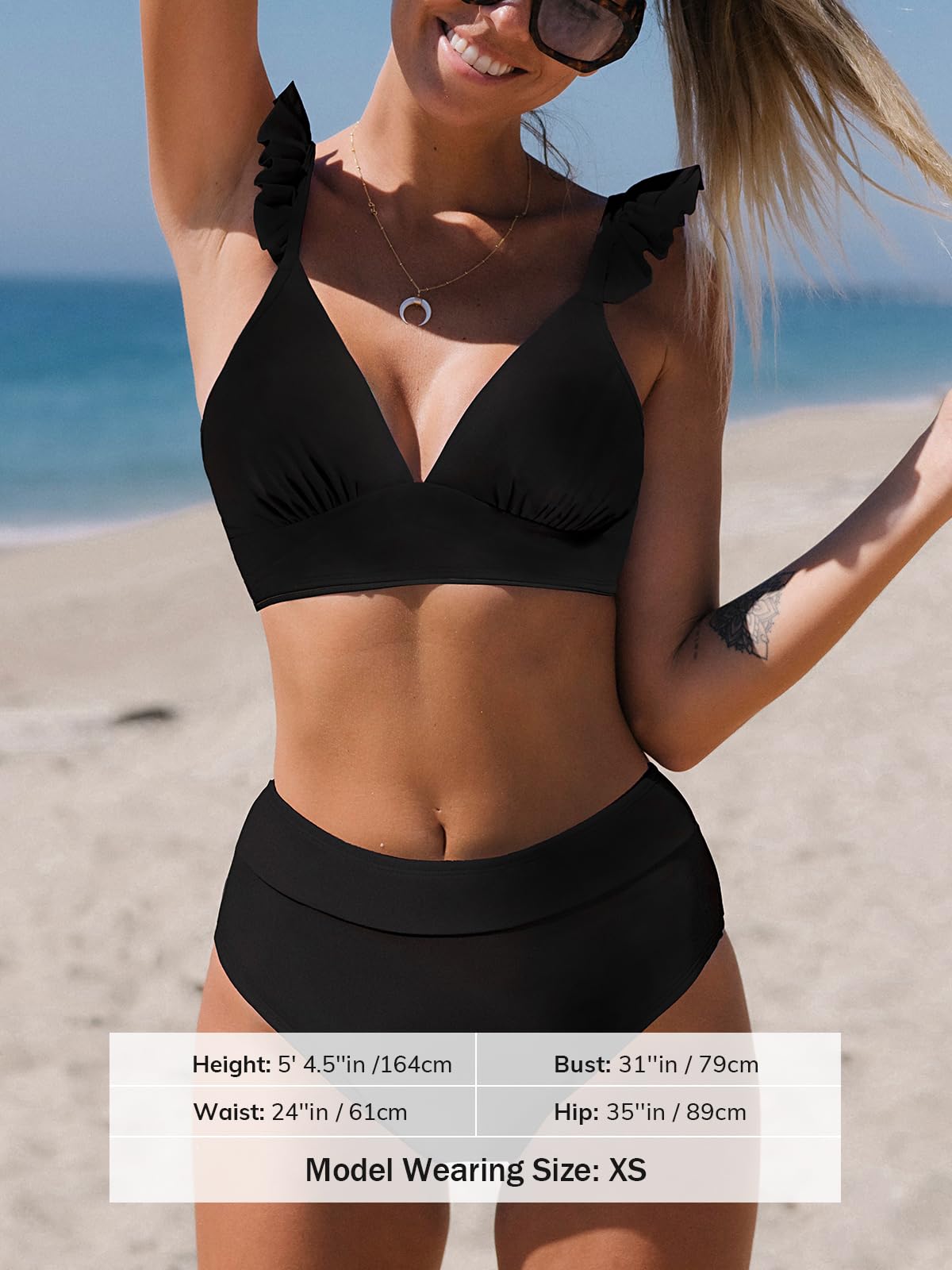 CUPSHE Women Bikini Sets 2 Piece Swimsuit High Waisted Bottom Ruffle V Neck Bathing Suits M Black