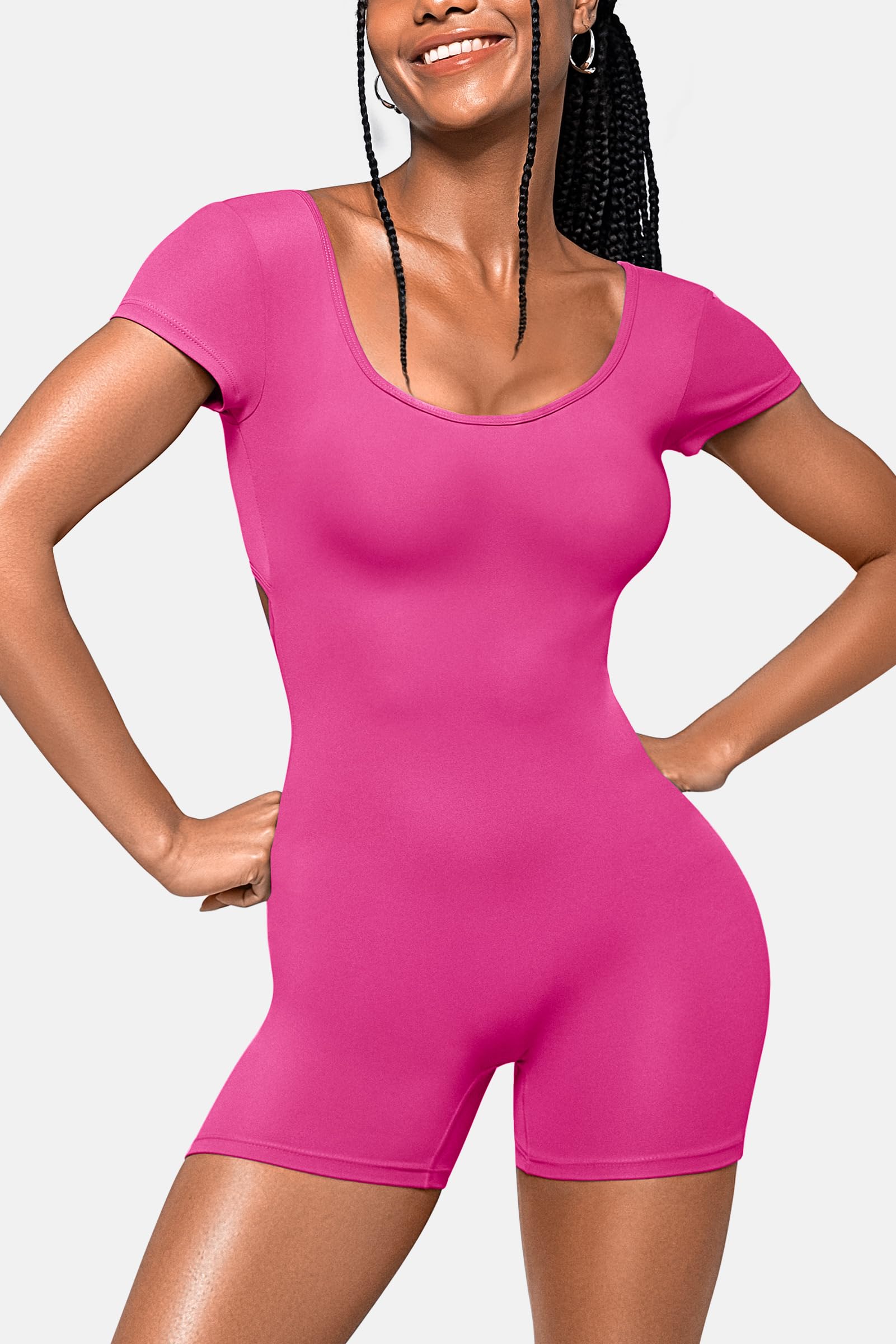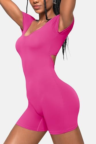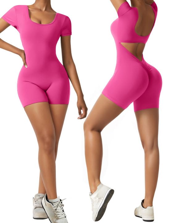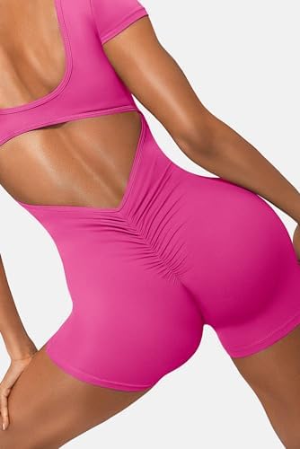 OEAK Short Sleeve Jumpsuit Workout for Women Square Neck One Piece Backless Tummy Control Bodycon Scrunch Butt Yoga Rompers(Hot Pink,L)
