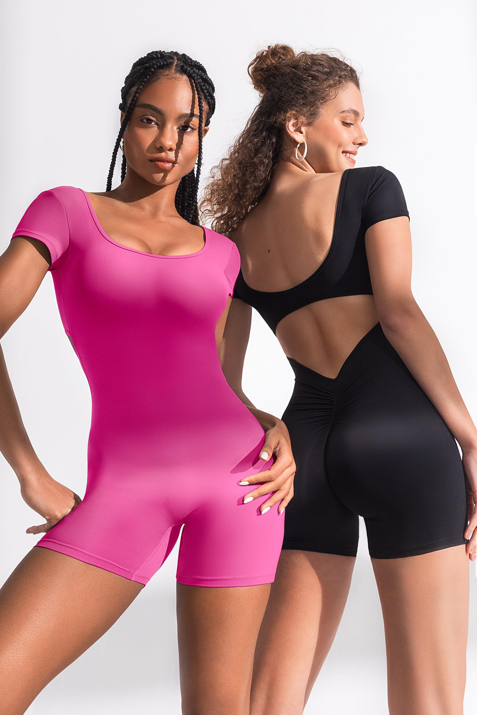 • 【Scrunch Butt Design】The V-back scrunch butt shorts jumpsuit enhances your natural booty shape, resembling a juicy peach. It features a gusseted crotch for greater freedom of movement and flexibility, making it a squat-proof athletic jumpsuit.