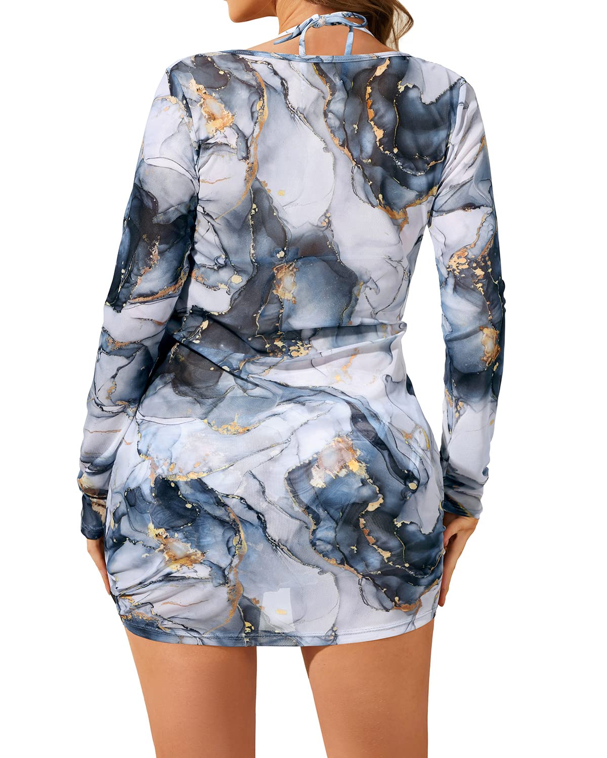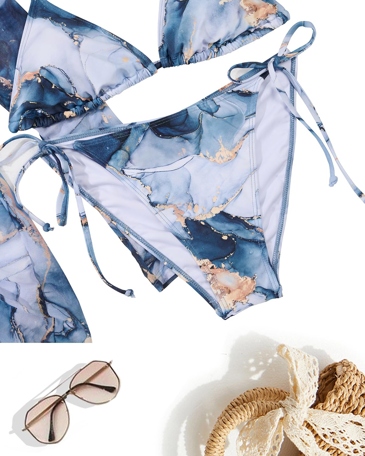 Blue White Marble Women Bikini 3 Piece Set Halter Bathing Suit Tie Side Triangle Bikinis Swimsuit with Mesh Beach Cover Up Swimsuits L