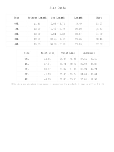 4XL:Length:21.9IN,Waist Size:44.1IN,Bust:42.5IN,Top Length:10.6/7.3IN,Underbust:37.0-52.0IN,Bottoms Length:13.4IN,Waist Size:37.8-55.9IN