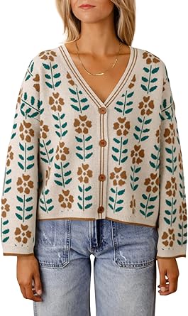 Saodimallsu Womens Floral Print V Neck Cardigan Open Front Button Down Knit Sweater Long Sleeve Loose Fashion Tops