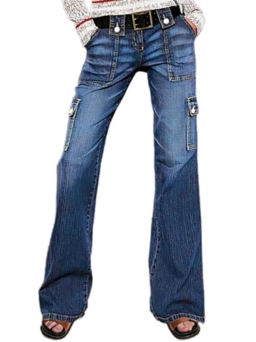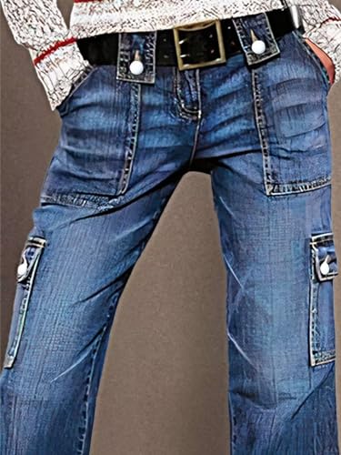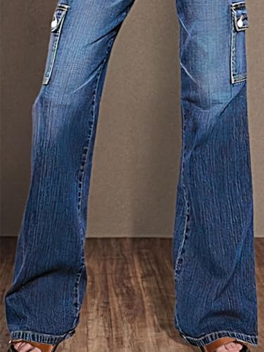 Flamingals Low Rise Jeans for Women Cargo Flare Jeans Flat Pocket Straight Leg Jeans Without Belt Mid Blue L