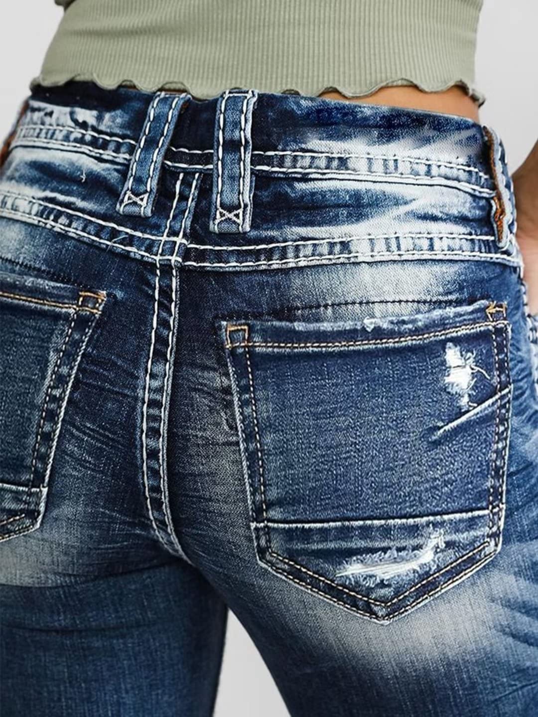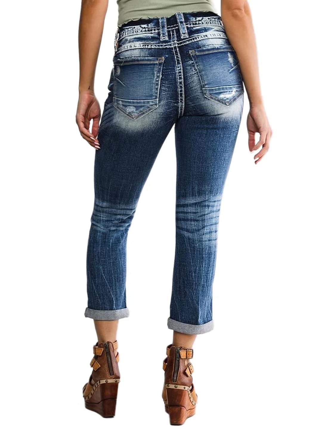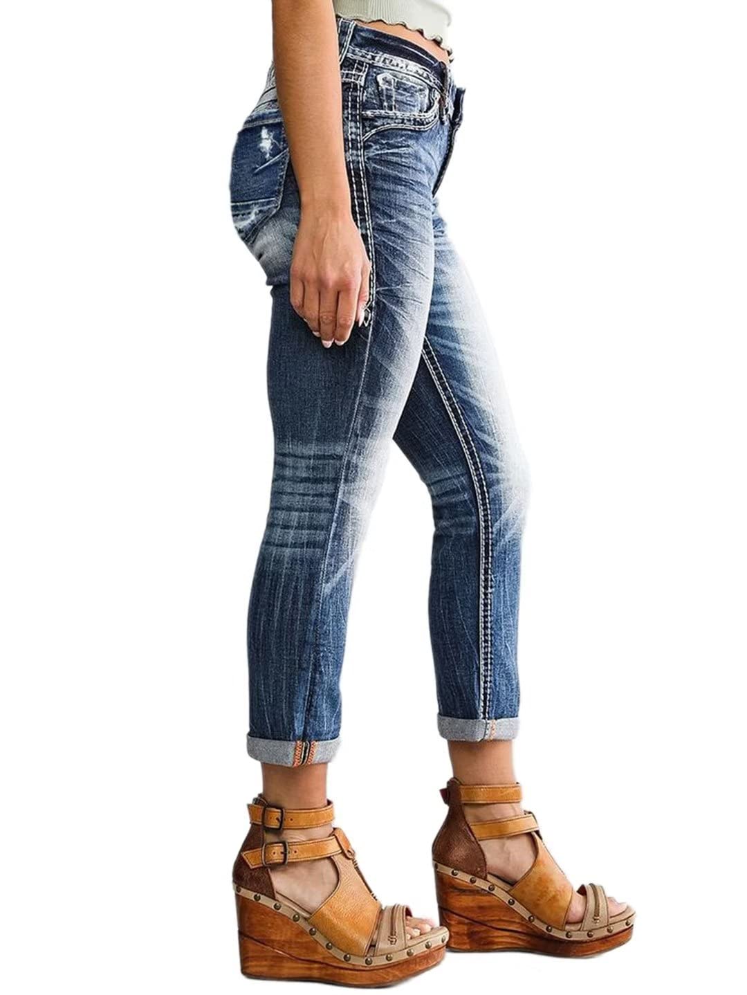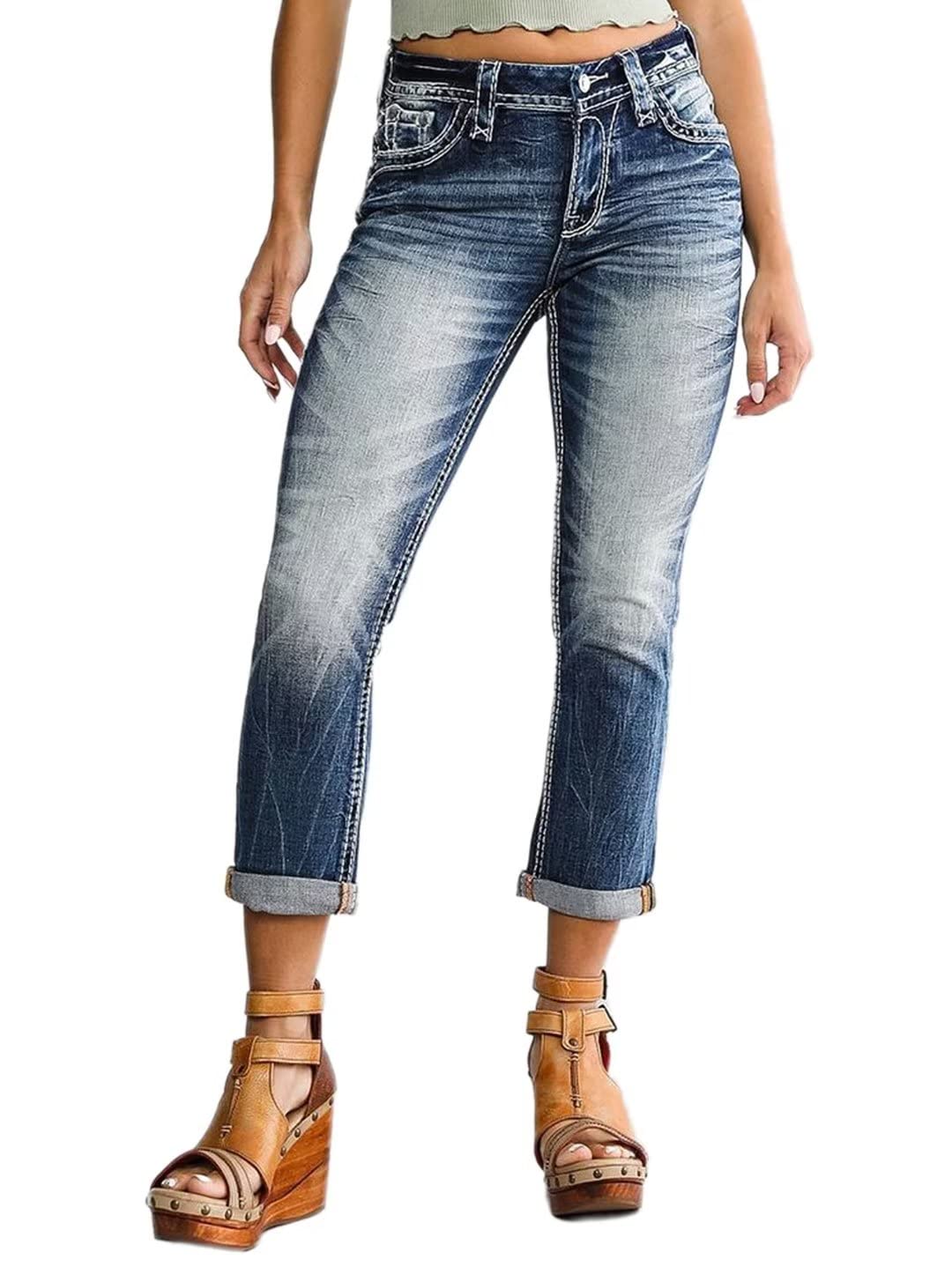 • Features: Pocket, button, zipper, roll hem, wash, mid waist, straight leg, capris, slight stretch. These jeans are perfect for off-duty days and beyond.