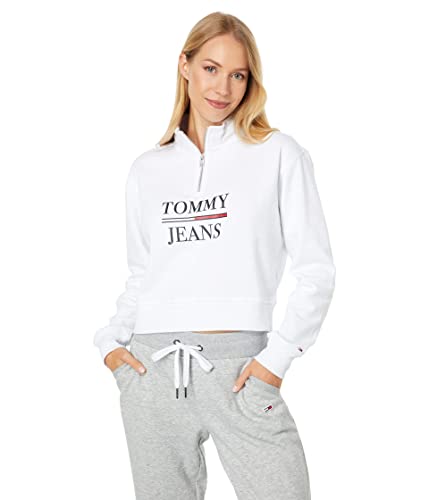 Details: This Tommy Jeans Women's Sweatshirt is a pullover with a 1/4 zip mock neckline, a logo at the front, and a ribbed hem