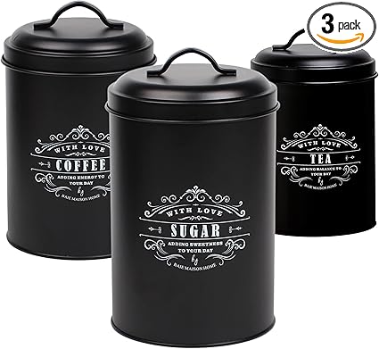 Baie Maison Large Black Kitchen Canisters Set of 3 - Farmhouse Canister Sets for Kitchen Counter - Coffee Tea Sugar Container Set - Rustic Kitchen Canisters for Countertop - Metal Kitchen Decor Jars