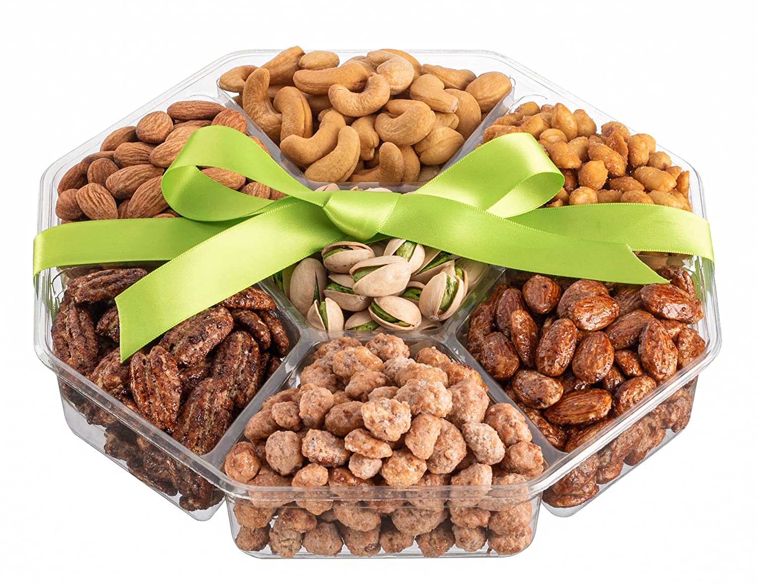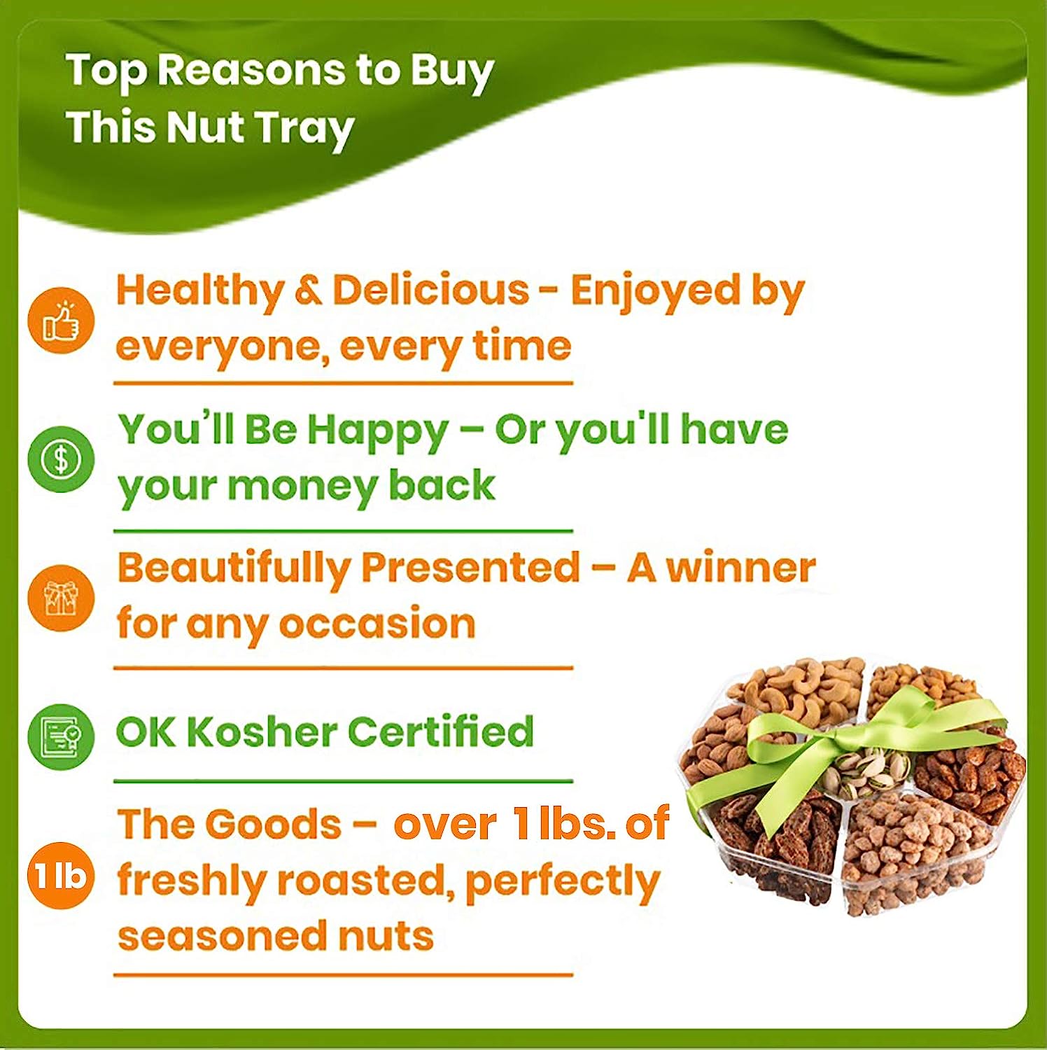 • VARIETY OF FRESH TASTY NUTS FOR EVERYONE TO ENJOY</i></b> – The deluxe mixed nut box contains Toffee Peanuts, Glazed Almonds, Dry Roasted Salted Almonds, Dry Roasted Salted Pistachios, Honey Roasted Peanuts, Dry Roasted Salted Cashews, and Glazed Pecans. SPECIFICATIONS – Package dimensions: 10x10x1.3. Net weight: Approximately 1LB. OK Kosher Certified, Vegan.
