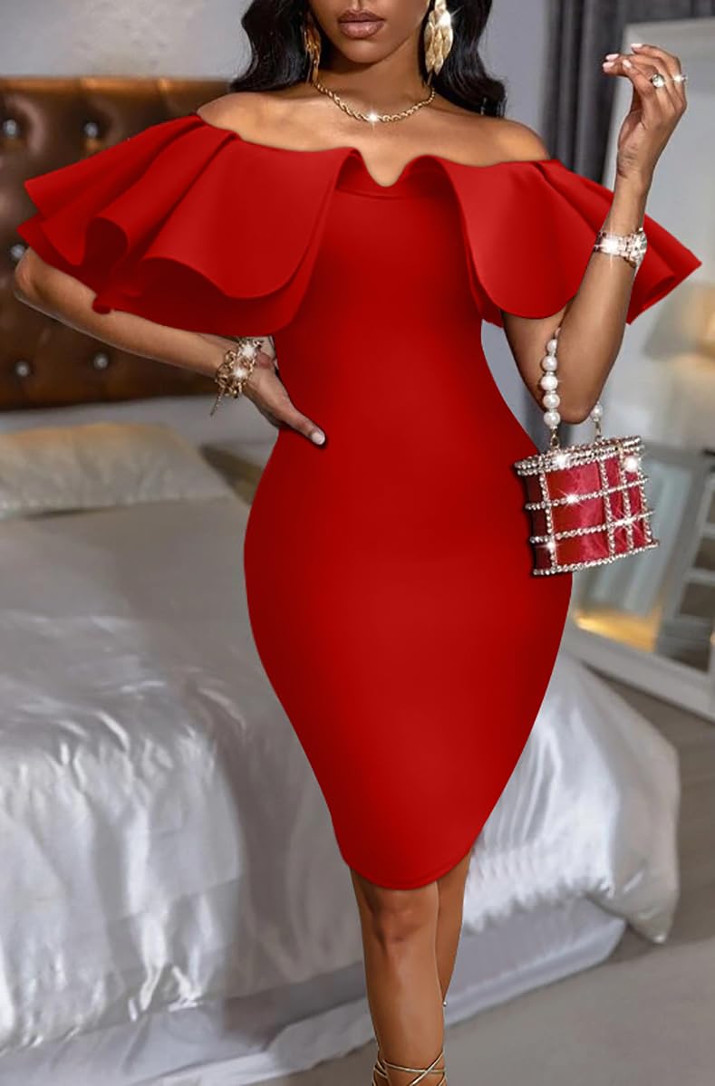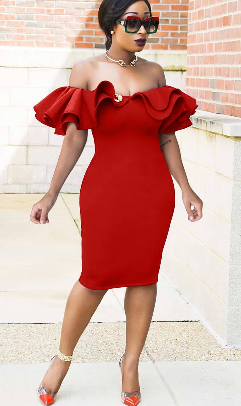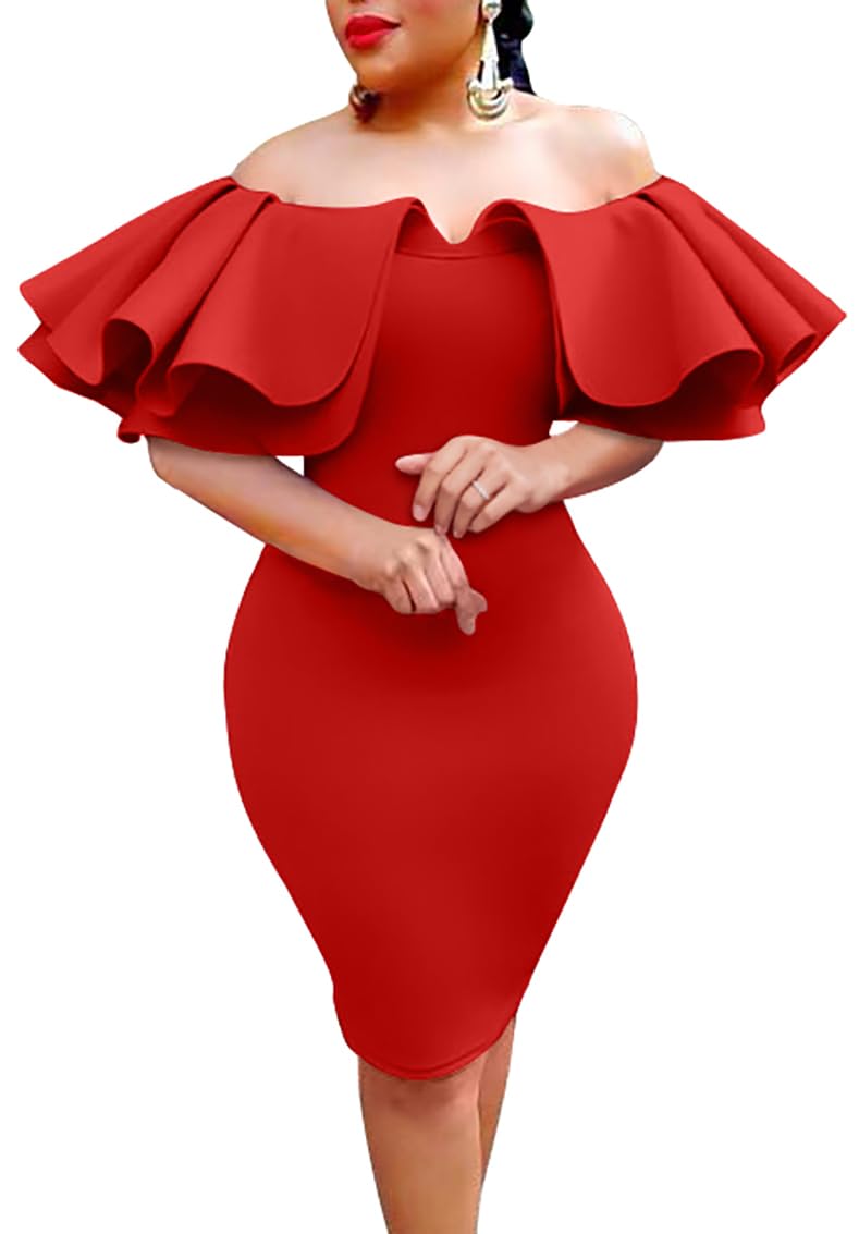 GOBLES Women's Sexy Off The Shoulder Ruffles Midi Cocktail Dress Red