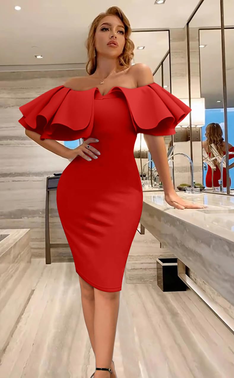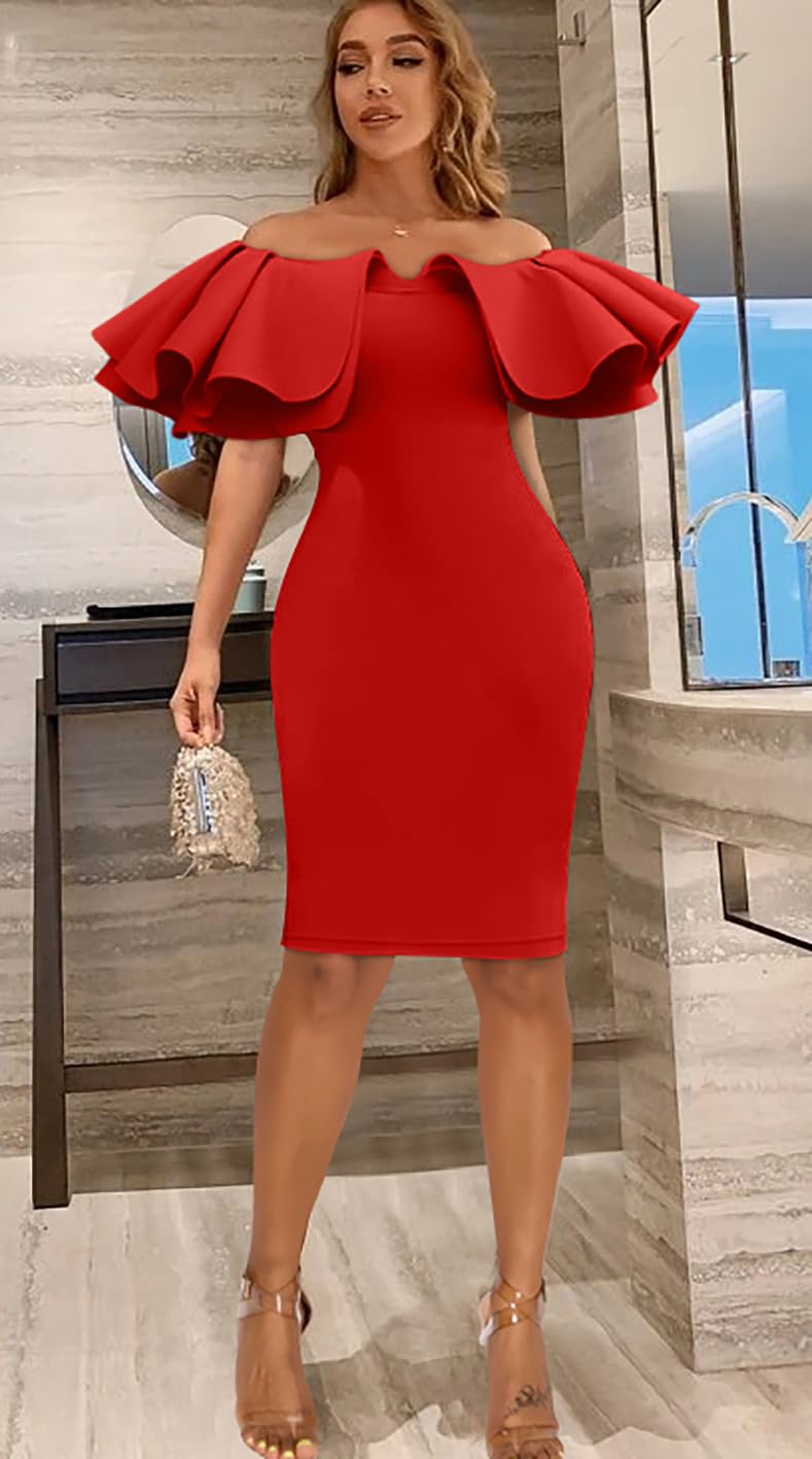 • Style:off the shodler design make the cocktail dress super sexy while the the double layer ruffles make you look elegant and unique.