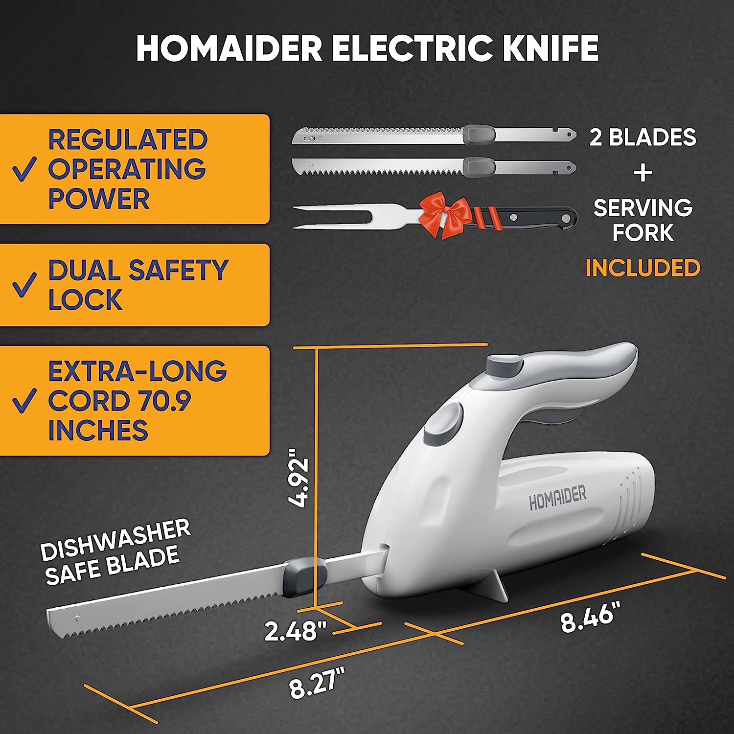 Homaider Electric Knife for Carving Meat, Turkey, Bread & More. Serving Fork and Carving Blades Included