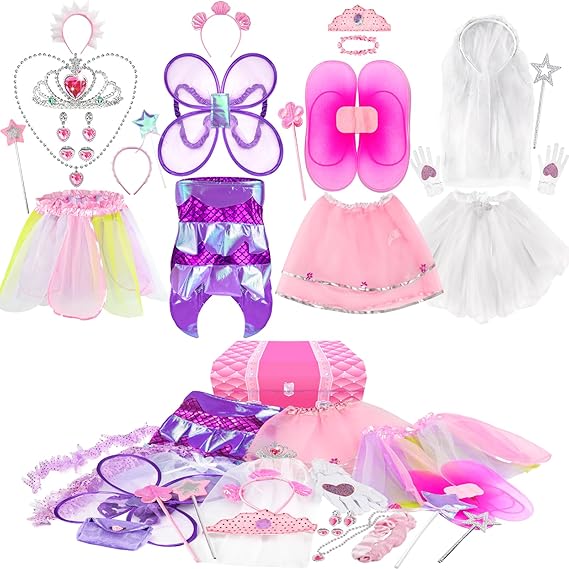 Jeowoqao Girls Dress Up Costume Set, Fairy and Mermaid Role Play Dress-up Trunk with Accessories 25pcs Little Girls Pretend Play Costume for Kids Age from 2-5