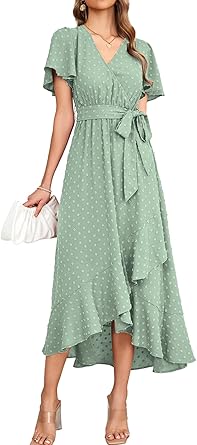 KUTUMAI Women 2024 Swiss Dot Maxi Dress V Neck Wrap Belted Ruffle A Line Flowy Boho Wedding Guest Long Dresses