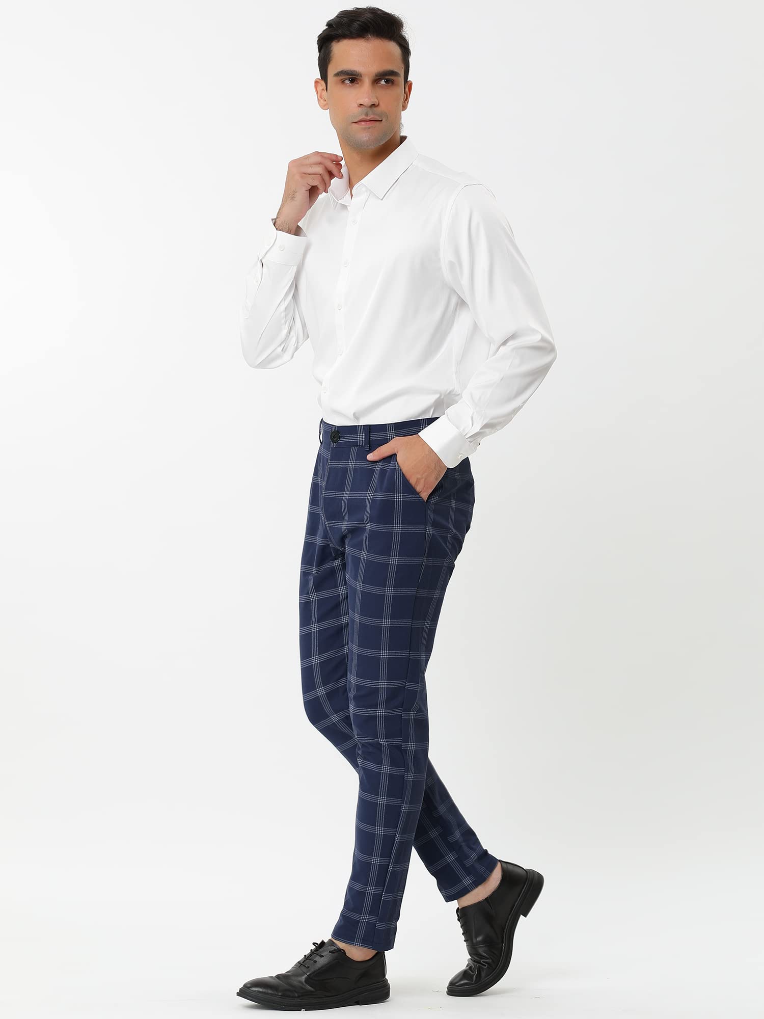 • Slim fit, tapered cut, button front with a zip-fly closure, classic plaid print business pants.