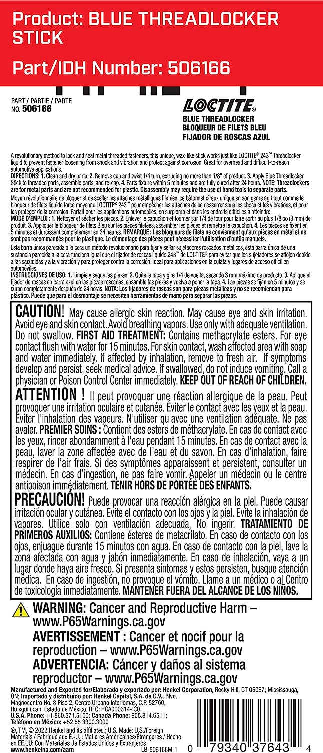 This medium-strength anaerobic threadlocker offers the same locking strength and sealing capabilities as our premium blue threadlocking liquid, LOCTITE Threadlocker 243. This wax-like stick is conveniently packaged in a self-feeding stick applicator. It is well-suited for difficult repairs, as in overhead applications. It can be applied to a part even if assembly if to take place at a later time, making the stick ideal for volume assembly. Removable with hand tools.
