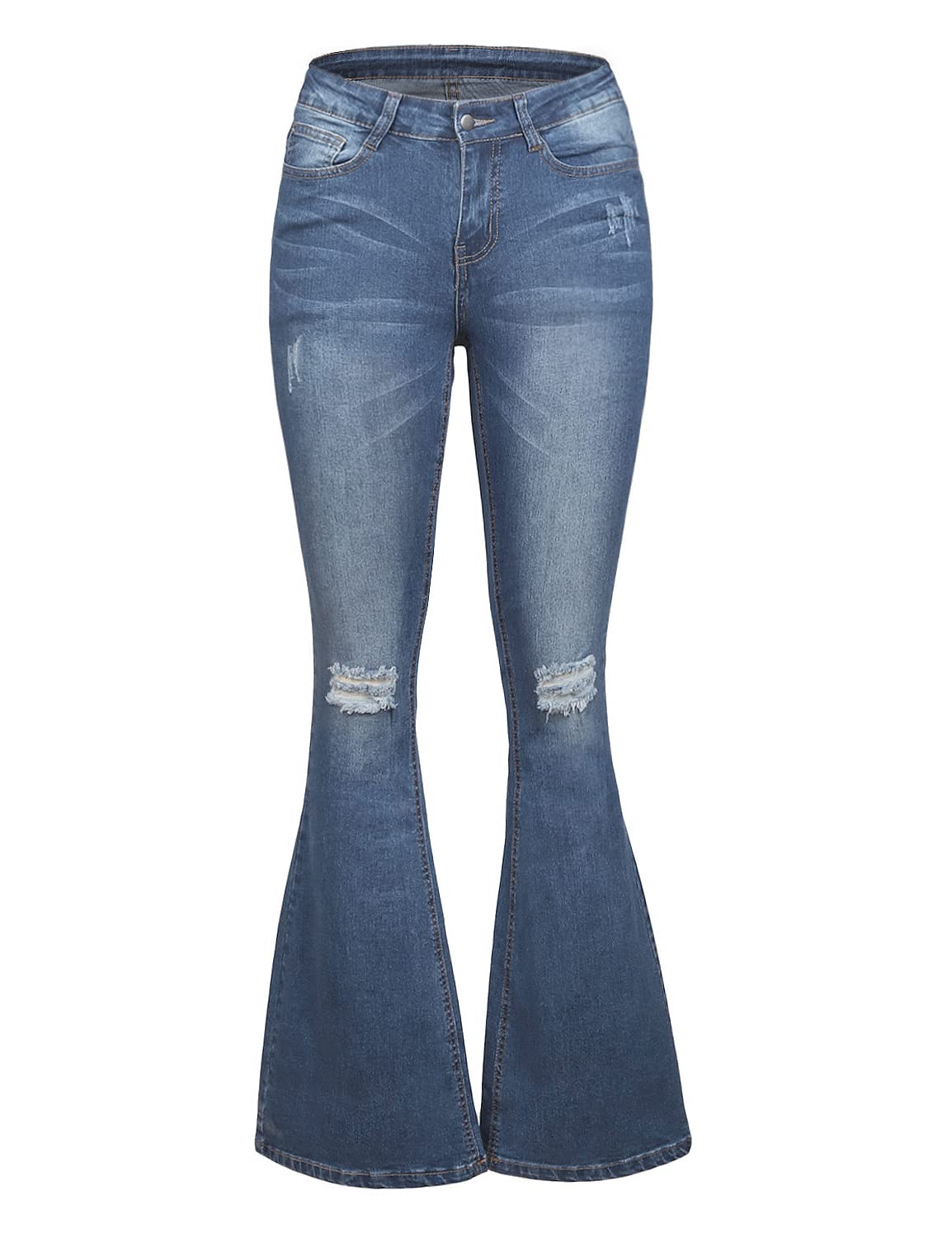 Ripped holes at the knee, wide flare leg for full comfort and freedom of movement.