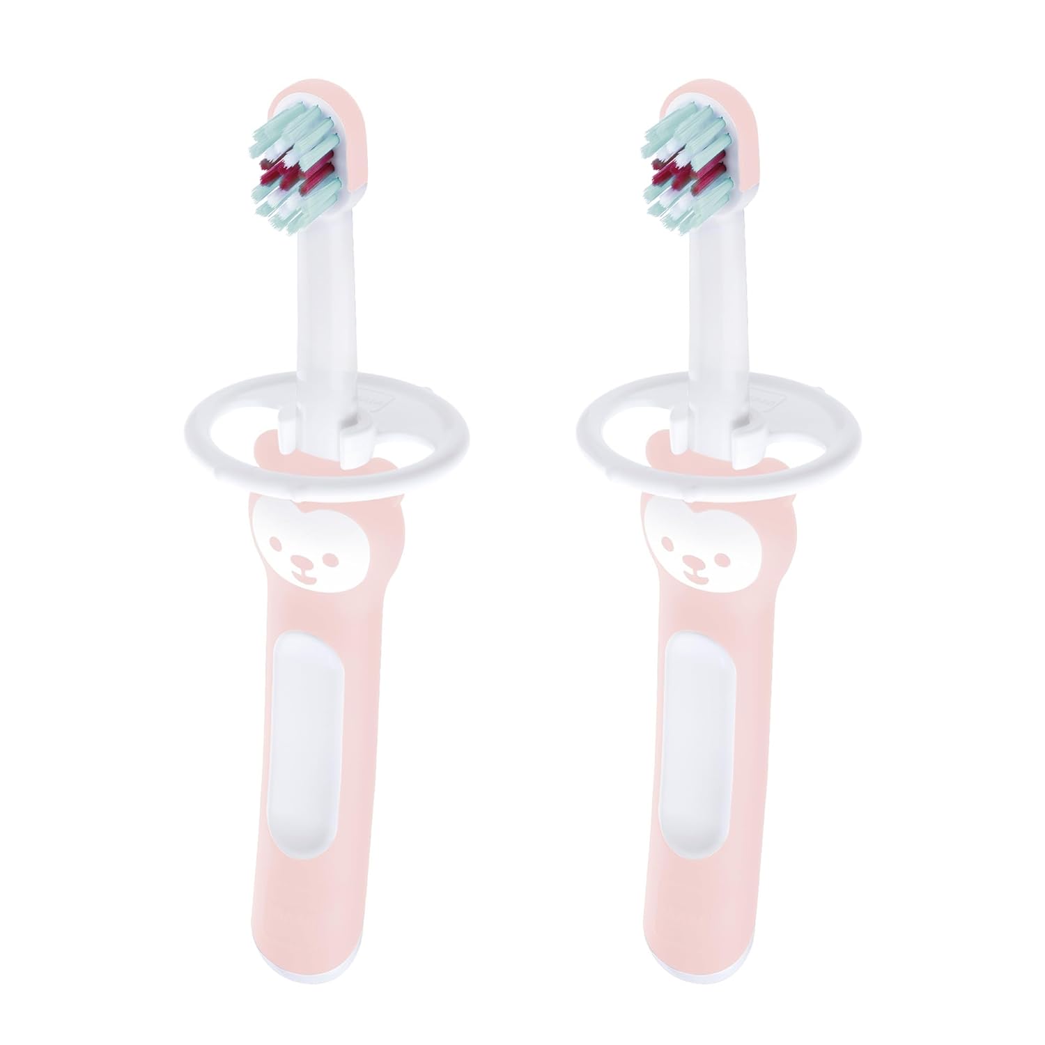 • PRODUCT DETAILS – MAM Baby Toothbrushes (2 Count Plus 1 Safety Shield), Baby Boy Toothbrush 2-Pack With Brushy the Bear Character and Compact Handles, For Boys 6+ Months, Blue
