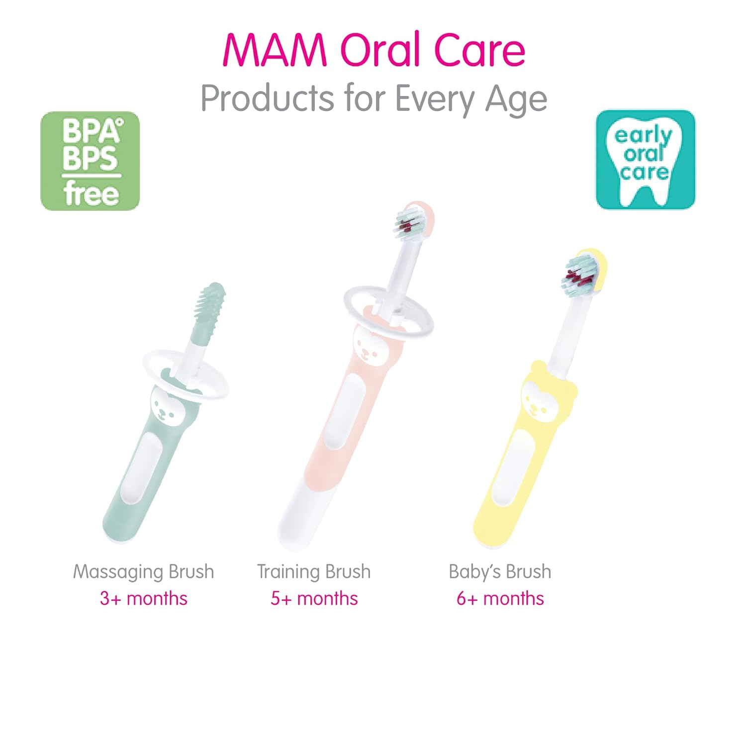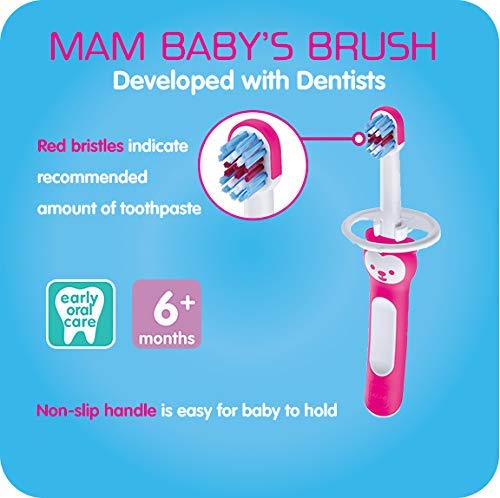 MAM oral care products have been developed with pediatric dentists to ensure babies develop effective and lasting oral hygiene habits from the beginning. The MAM Baby's Brush baby toothbrush has a compact handle perfectly sized for baby's hands so they can learn how to brush their teeth independently. The soft rounded bristles remove plaque and bacteria, and the head adapts perfectly to baby's mouth, making it the ideal Baby's Brush for baby. The bottoms of the handles on these first toothbrushes are uniquely shaped to massage sensitive gums and clean baby's tongue. With a short handle to help baby practice brushing on their own and red bristles to indicate the recommended amount of toothpaste to use, the MAM Baby's Brush for baby helps baby begin to use a toothbrush on their own. MAM knows that being a parent is not always easy, so we make products that are smart and simple to use. For over 40 years we've been obsessed with making innovative pacifiers, bottles, cups, teethers, and toothbrushes, providing babies with optimal care at all stages.