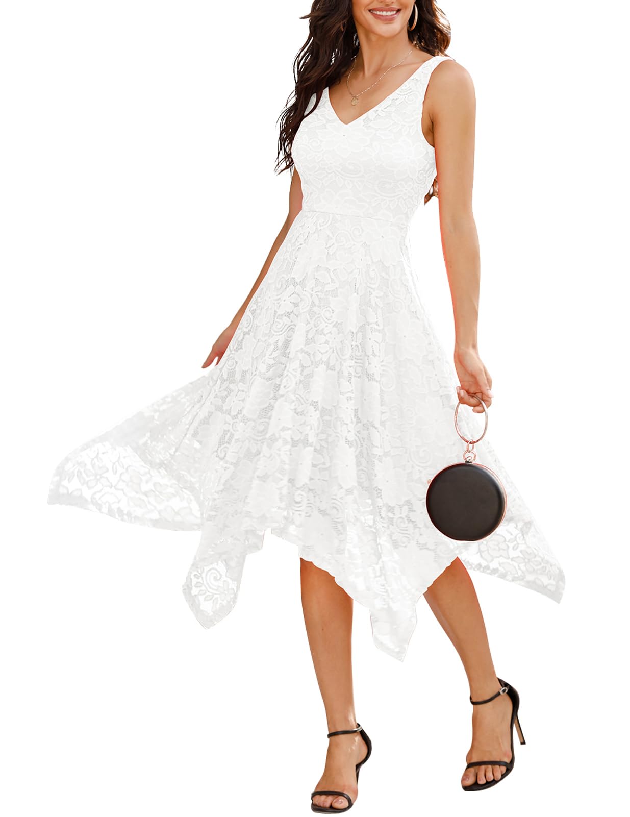 • Features: This swing wedding guest dress is ideal for spring and summer weddings, exuding a romantic and feminine look. Its handkerchief hem design features a V-neck, sleeveless cut, and a flattering high waist that suits all body types