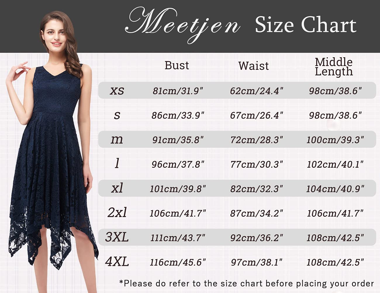 Details: Welcome to MEETJEN Fabric: Lace ,Neckline,V-neck Back Details:Zipper-up Back Silhouette:A-line Sleeve Length:Sleeveless Occasion:Garden, Wedding, Prom, Party, Bridesmaid, Homecoming, Evening, Cocktail Features:1.With its delicate v-neck neckline design on the top, this elegant tea-length dress can be a good choice for your event. 2.Dress it up for weddings, galas, evening parties, garden, prom, , homecoming, cocktail,Fits for 50s or 60s Party, rockabilly vintage Party, Bridesmaids, wedding guest, Rehearsal, Sock Hop, Concert, Trip, Causal wear and other special occasions.this dress can be your good companion in most venues. 3.Great choice for evening dress, prom dress, homecoming dress, bridesmaid dress, daily dress, work dress, wedding reception dress, birthday party dress, pin up cosplay dress, wedding guest dress, semi formal formal party dress, cocktail dress and vacation dress,Here's how our customers apply this dress:for a Valentine’s Day dance,homecoming dresses,a wedding,for my 12 years old daughter,1960s afrocentric style,ceremony,for my bridesmaids,Christmas party,for my senior prom,for my daughter for the homecoming dance,going to a restaurant,for my bridal shower. 4.Available in 6 sizes:XS,S,M,L,XL,XXL/2XL. 5.The color of this dress is rich:black,blush,burgundy,Champagne,coral,Champagne,Grape,grey,Lavender,navy,Pink,royalblue,White.Applicable season: spring, summer, autumn, winter. Style: audrey hepburn style vintage 1920s,1950's ,1960's,1940s,50s,rockabilly swing evening dress for women plus size. Tips:Please do choose the size referring to our size chart. DO NOT use Amazon size chart. 2.As all the pictures are taken by actural item,color differences may exist among different display screens. 3.Any suggestions for improvement are highly appreciated. Please feel free to contact us anytime.