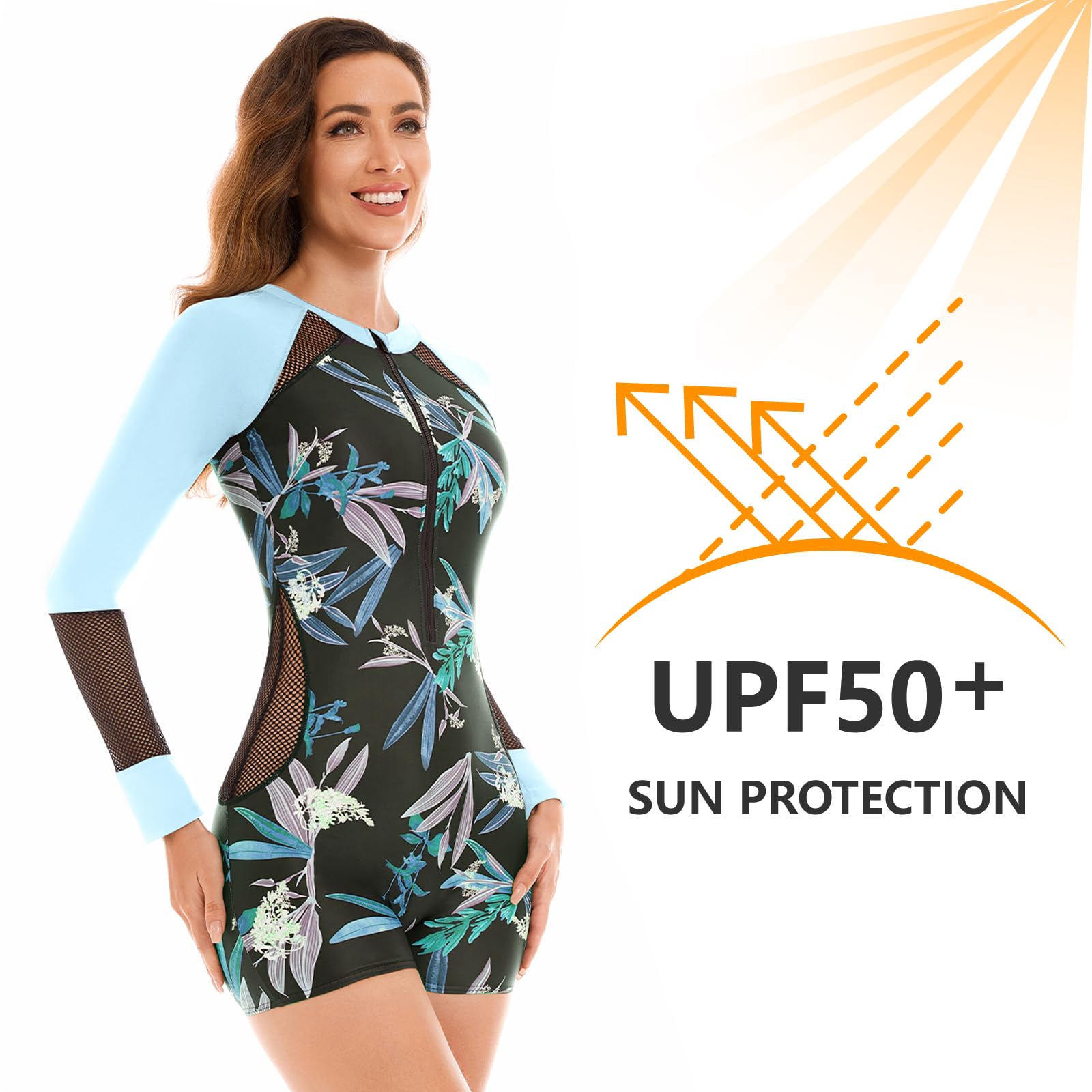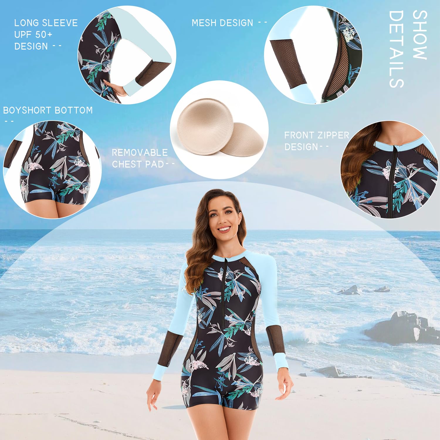• πŸ„[Fashion-Forward Designs]: The long sleeve one piece swimsuit is designed with pretty print and flatlock seams for a beautiful and durable fit. Rash guard bathing suit women with a front zip for easy on and off. Rash guard women one piece built-in removable bra offers enough support.
