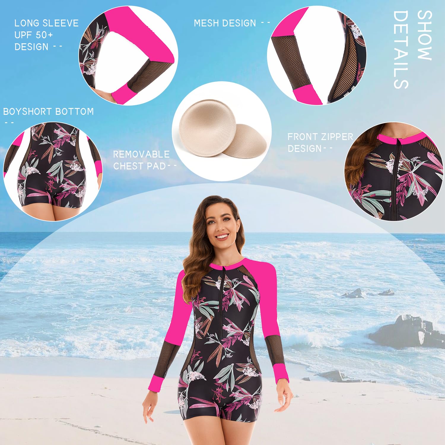 • πŸ„[Fashion-Forward Designs]: The long sleeve one piece swimsuit is designed with pretty print and flatlock seams for a beautiful and durable fit. Rash guard bathing suit women with a front zip for easy on and off. Rash guard women one piece built-in removable bra offers enough support.