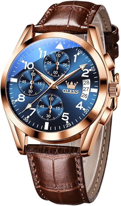 OLEVS Men's Watches Leather Strap Analog Quartz Watch, Fashion Big Dial Date Waterproof Watch, Dress Luxury Luminous Men Watches