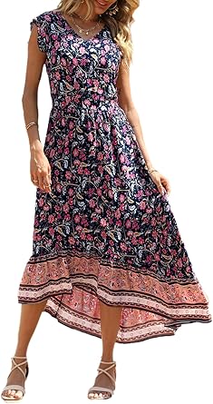 PRETTYGARDEN Women's Summer Maxi Dress Casual Floral V Neck Cap Sleeves Boho High Low Flowy Midi Long Sun Dresses