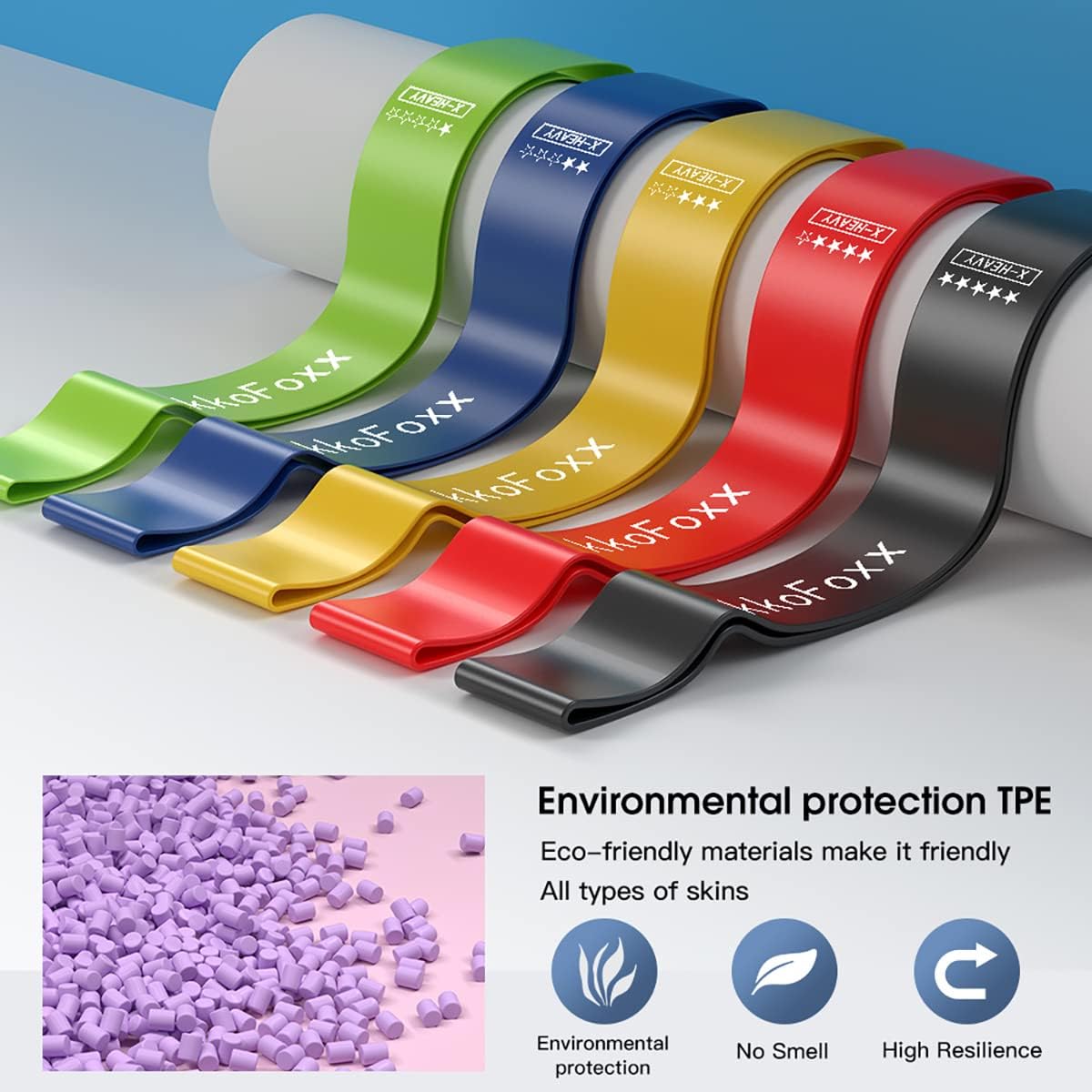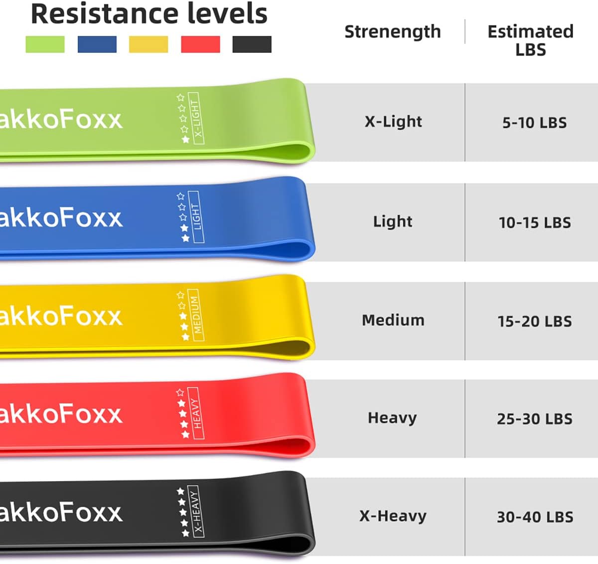High end exercise bands. Our 12″ by 2″ heavy duty loop resistance bands come in 5 varying resistance levels. This makes them perfect whether you are just starting to workout or a seasoned workout warrior. Our extra light and light bands are great for beginners, while our medium, heavy and extra heavy exercise bands are targeted for more intermediate and advanced strength training.